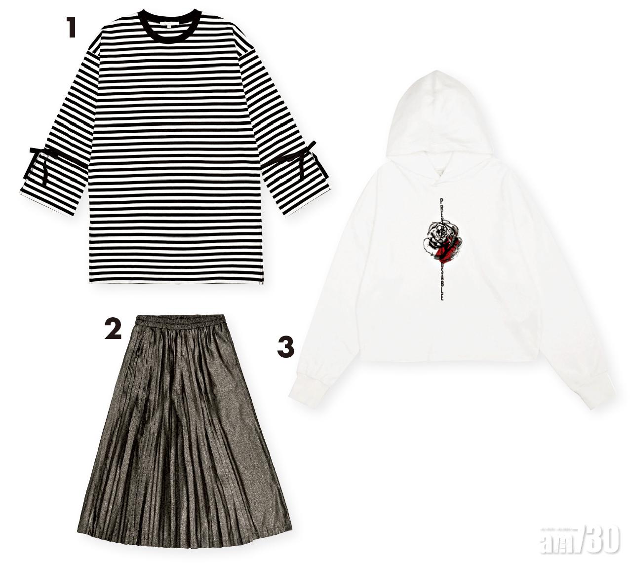 1.黑白色橫間七分袖top $499(A) 2.銀灰色百褶skirt $799(A) 3.白色玫瑰花圖案hoodie $499(A)