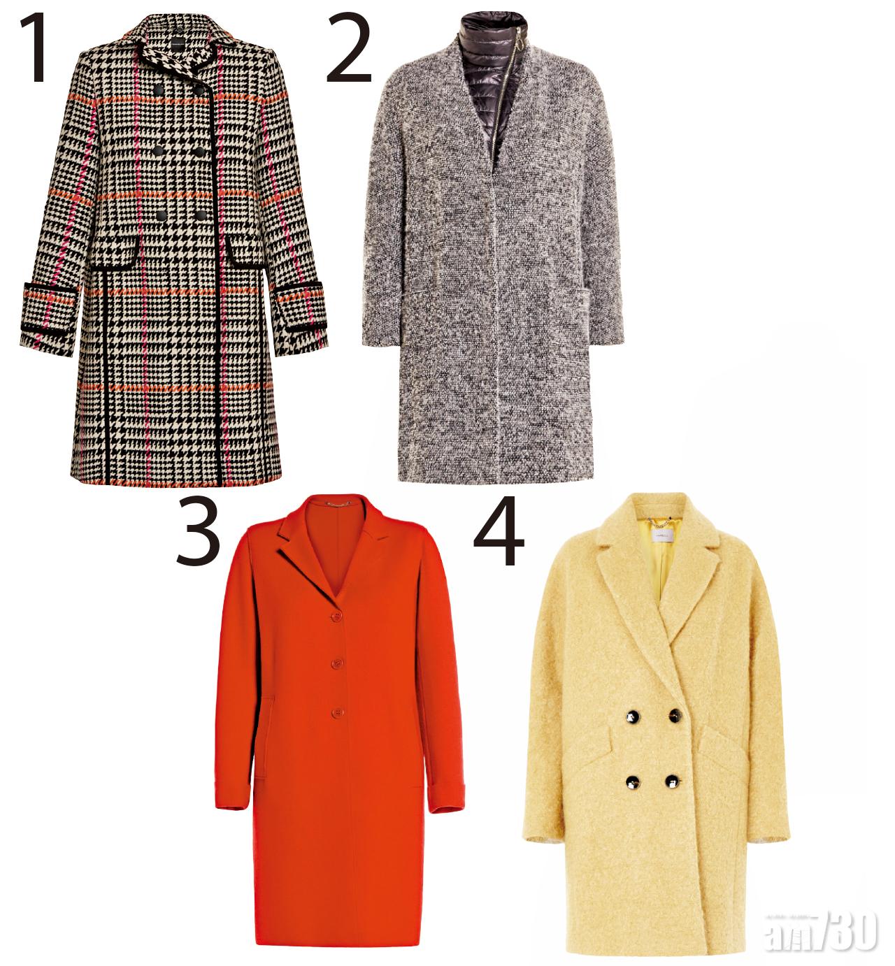 1.黑白紅色千格long coat $5,180(F) 2.灰白色針織綴羽絨內裡long coat $4,880(G) 3.紅色呢絨long coat $4,780(G) 4.黃色毛絨孖襟long coat $8,180(G)