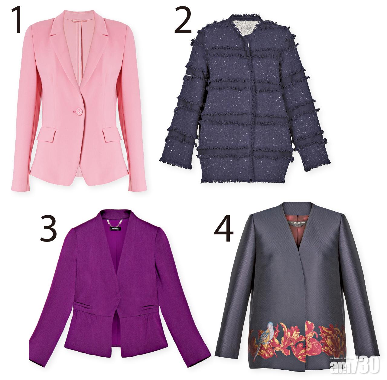 1.粉紅色blazer jacket $4,580(D) 2.藍色毛毛tweet jacket $8,680(H) 3.紫色jacket $4,180(E) 4.黑色刺繡floral print blazer jacket $9,980(H)