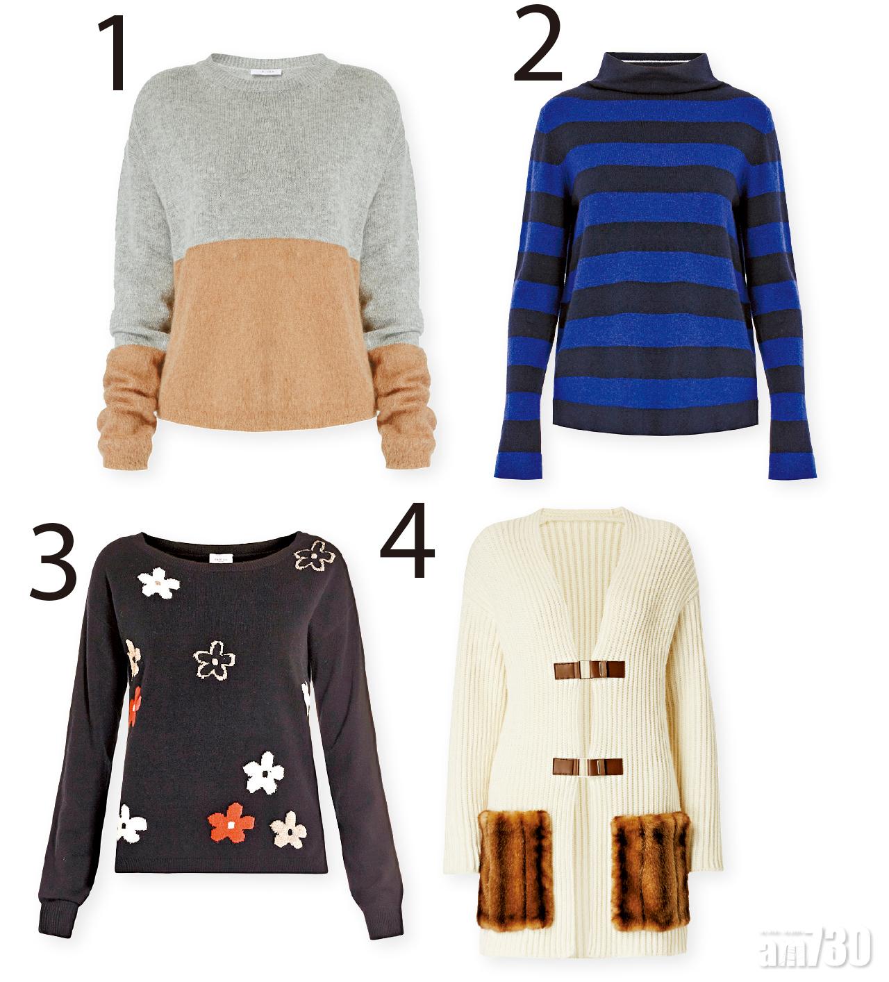 1.灰拼淺啡色tow tone kint top $2,380(D) 2.藍黑橫間樽領kint top $1,580(G) 3.黑色floral print kint top $2,580(G) 4.白色皮扣毛毛側袋cardigan $4,880(D)