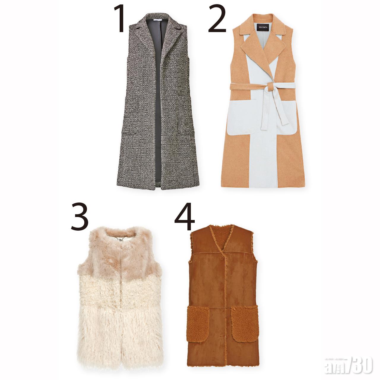 1.灰白色vest blazer $3,780(D) 2.灰拼淺啡色呢絨束腰vest coat $6,580(E) 3.淺啡拼杏白色fake fur vest coat $2,980(F) 4.啡色麖皮綴毛絨vest coat $2,880(F)