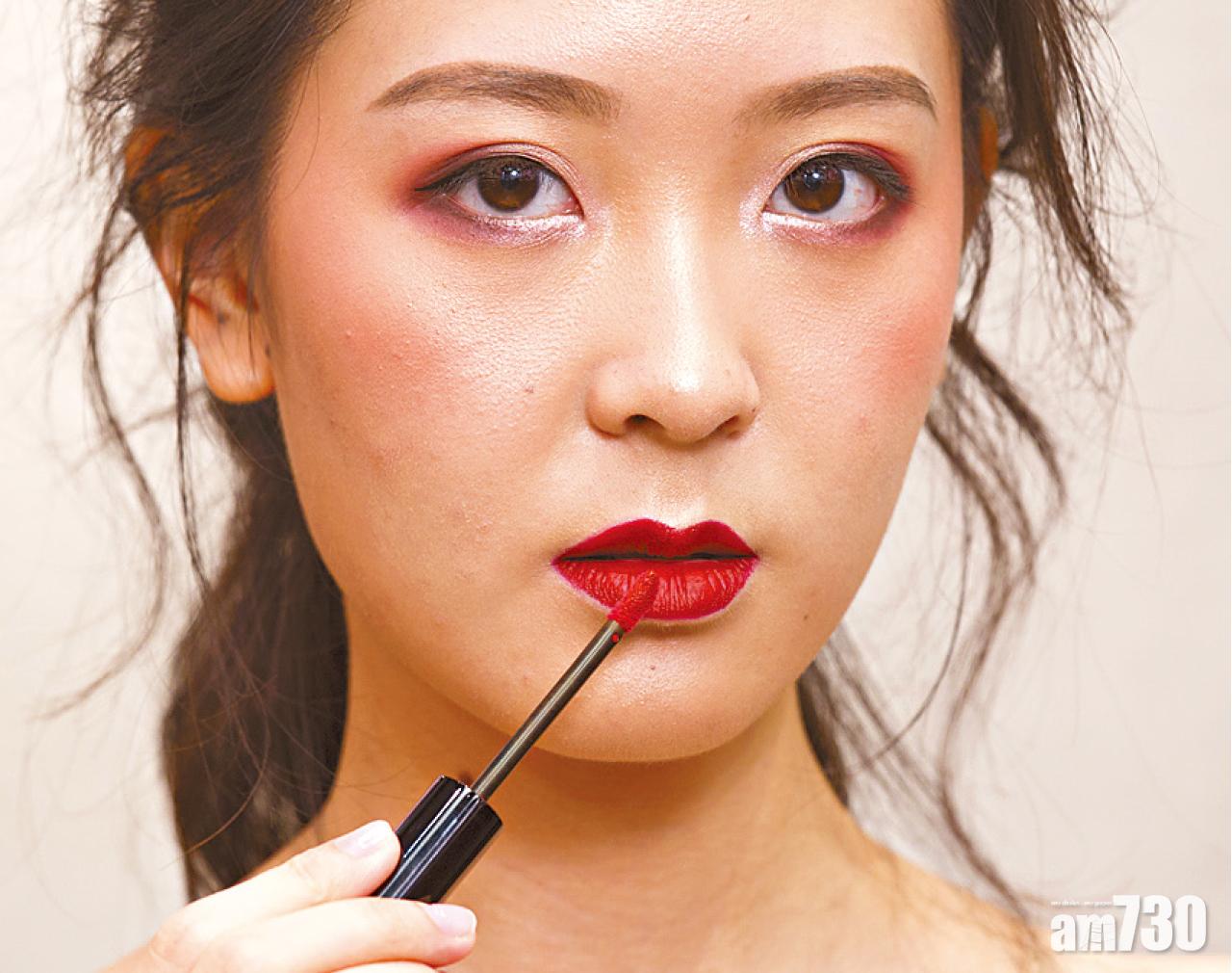 Step 3 : 塗上高度顯色的啞緻霧感深紅色唇釉,讓焦點集中在唇妝上,營造性感神秘的形象。