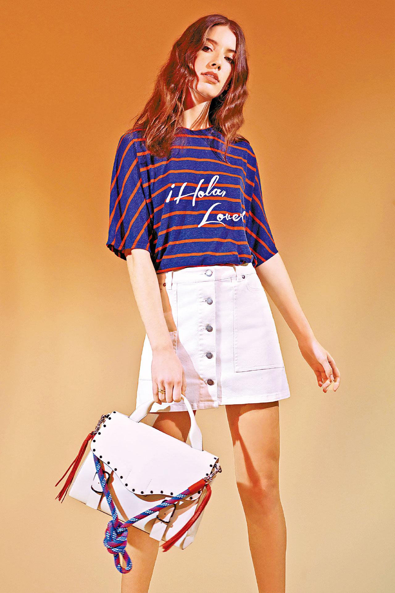 藍底紅色條子鬆身闊袖tee,配白色牛仔短裙,盡顯青春活力,causal Friday上班服之選。($990,REBECCA MINKOFF)
