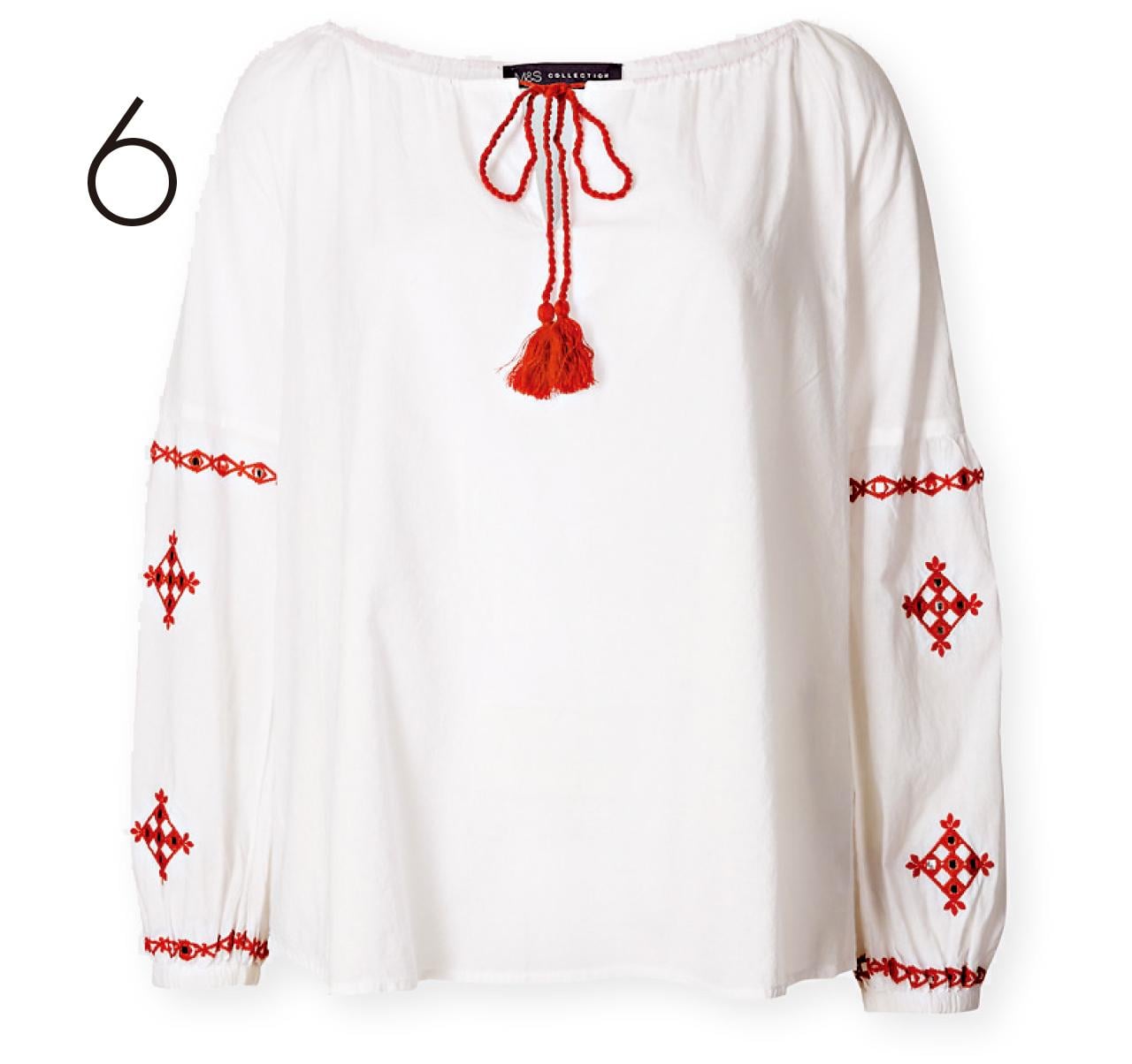 5. 像小學校服的圓領口配波浪形衫腳令人重拾童真,不妨配一條及膝半截裙子,做個可愛女學生吧!($1,995,Cocktail) 6. 繡有紅色圖案的白色長袖上衣,帶點民族風格,配草帽和長裙,這樣穿去郊遊也不錯。($399,M&S)