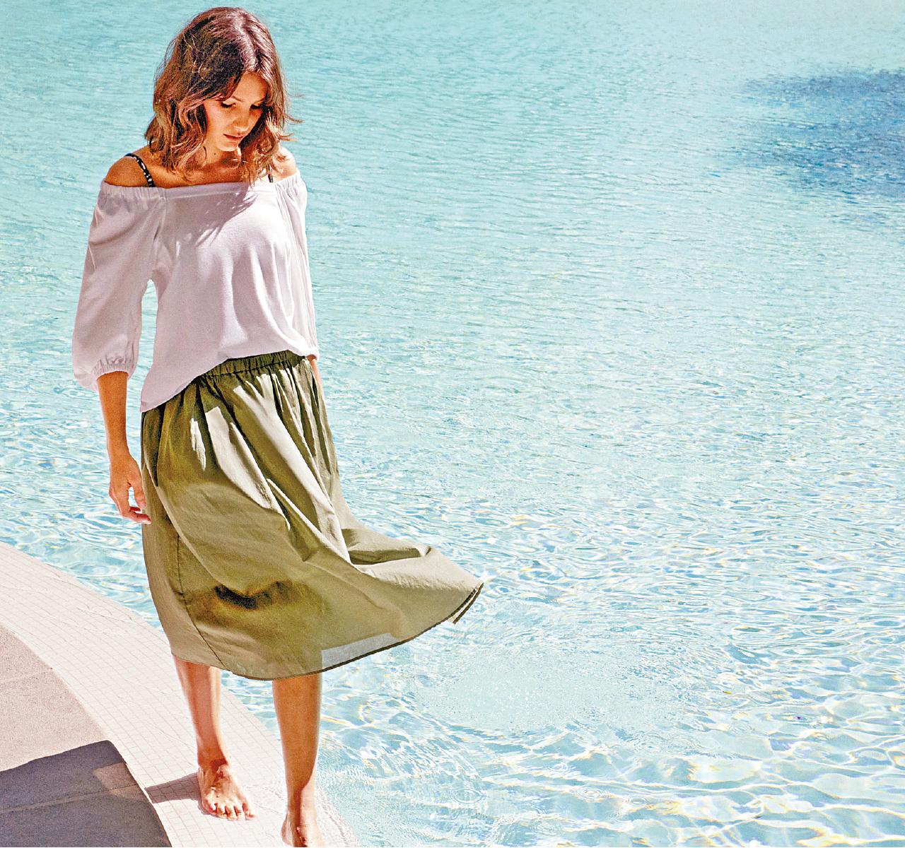 白色七分袖off shoulder上衣,特精細純棉布料,輕軟柔滑,舒適的同時更帶出一份飄逸感。(上衣$149及裙$199,Uniqlo)