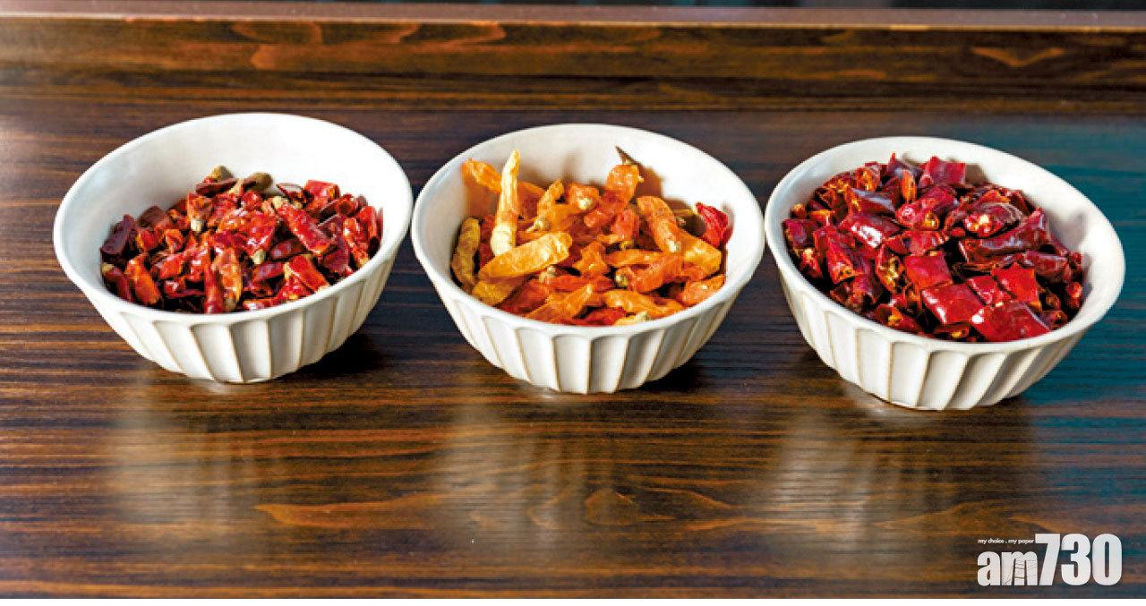 呈鮮橙色的辣椒王,又名貴州椒,可謂辣中之辣(中),其次是魔鬼椒(左),色水最紅的子彈椒反而最溫和(右)。
