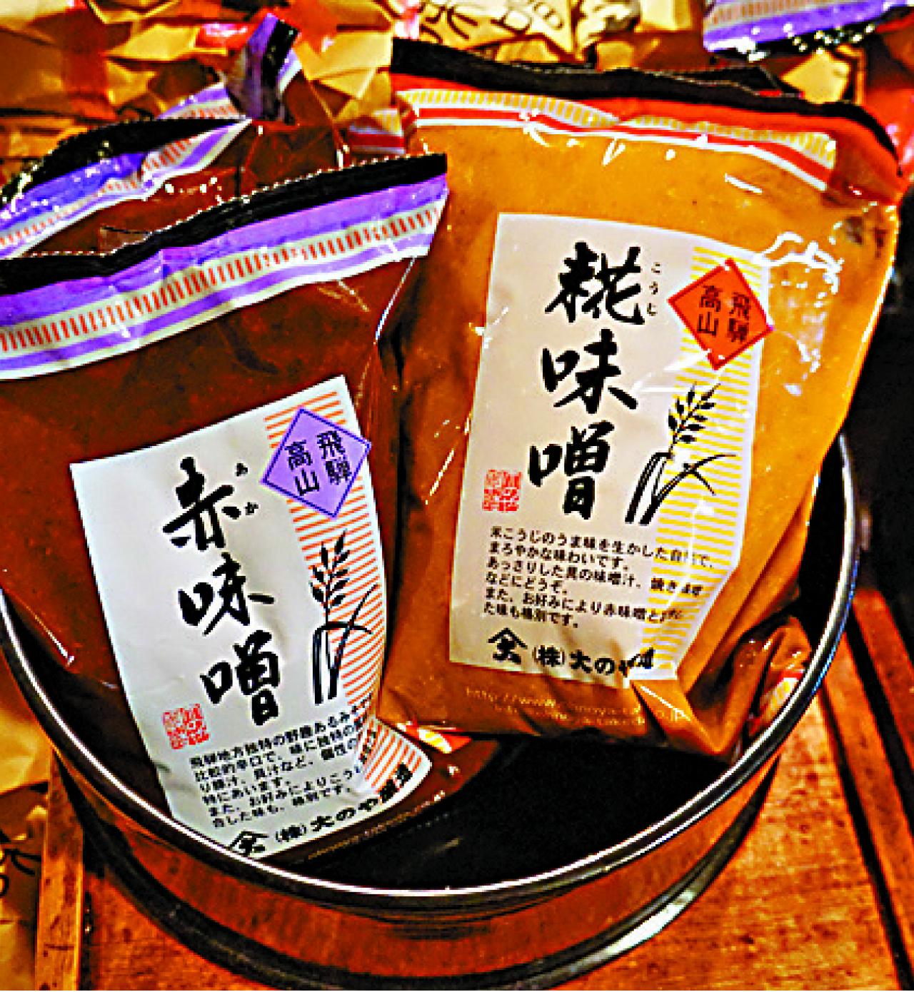 大部分遊客來到,都會馬上找飛驒牛來吃,串燒、壽司,還有牛肉包,不過,我衝往的方向是味噌,株式会社大のや釀造的味噌,就連皇室也指定的口味。門口有兩個木牌寫著赤味噌和糀味噌,赤味噌顏色比較深,味道會較鹹,但不是死命的鹹,滲有滋味豆香,而糀(こうじ)味噌則是俗稱白味噌,味道淡一點,少吃的人會較喜歡,我想也不想,拿兩大包便付錢去。