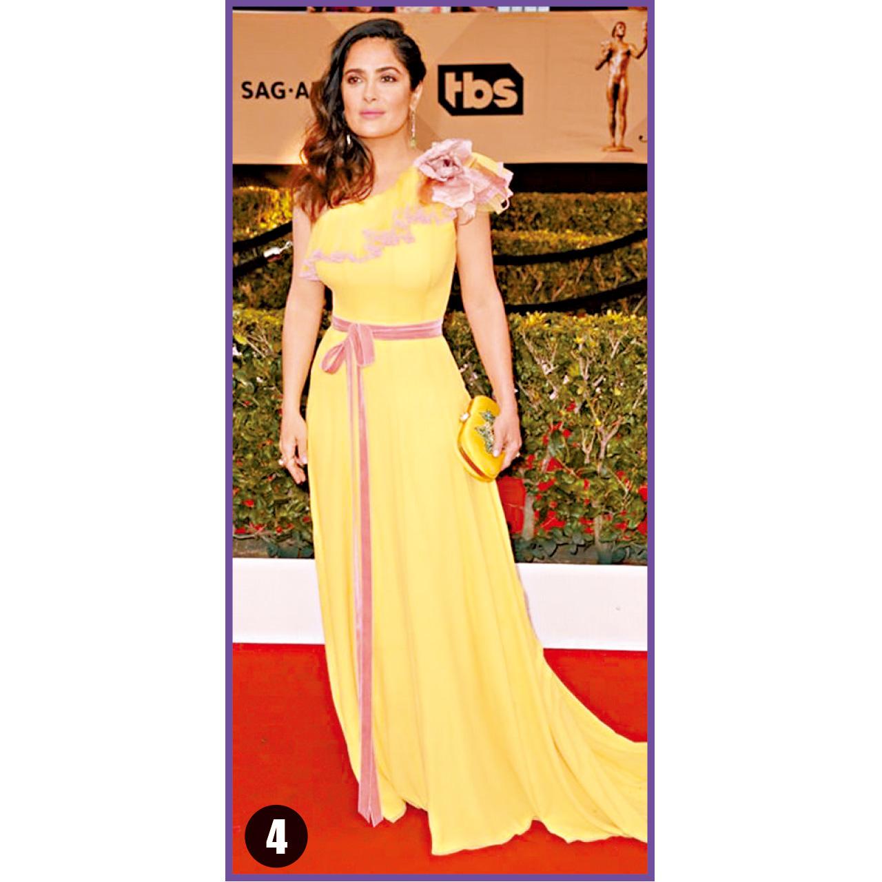 法國開雲集團(Kering SA)老闆娘Salma Hayek(圖4),現身第23屆美國演員工會頒獎禮(SAG Awards)時,選擇Gucci黃色絲質雪紡晚裝,玫瑰粉色絲質花朵裝飾及天鵝絨蝴蝶結腰帶增添浪漫女人味,配黃色embroidered clutch,流露奢華氣息。而英國BAFTA影后愛瑪史東(Emma Stone,圖5),也穿著Gucci 2017春夏黃色印花單肩裙出席今年的金球獎派對。