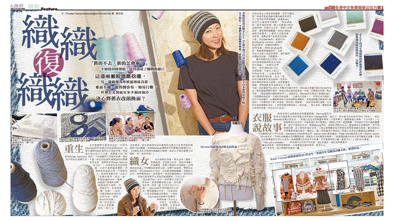 由形象顧問投身時裝設計,何海泠(Denise)前年前創立時裝品牌Knotti,以歷久彌新的設計重新打入時裝市場,希望能以個人的小小力量,扭轉當下的「快食時裝(fast fashion)」文化。「形象顧問工作固然有趣,現在亦不時接洽相關工作。不過,眼見時裝圈內推陳追新的節奏愈見急速,我開始思考slow fashion的文化。」但時裝世界的光怪陸離,叫她不捨得抽身離開,然而換季的速度之快,不管是名人,甚或是普羅大眾,也染上了浪費的陋習。因此,她希望透過Knotti,重新改造被人唾棄的衣飾,無論是款式過時、衣物被沾污,抑或是破爛,她都一一回收,令被丟棄的衣服可得到新生命。現時Knotti的衣飾,每一件作品均以全人手限量製作。除了以來自澳洲、對生態環境友好的農場所生產之可生物降解紗線KPC Yarn編織,亦從Redress(環保非牟利團體)收集舊毛衣。「手織毛衣的手感絕非機織的可媲美,而且人手製作產量少而精細,有一定的市場。」