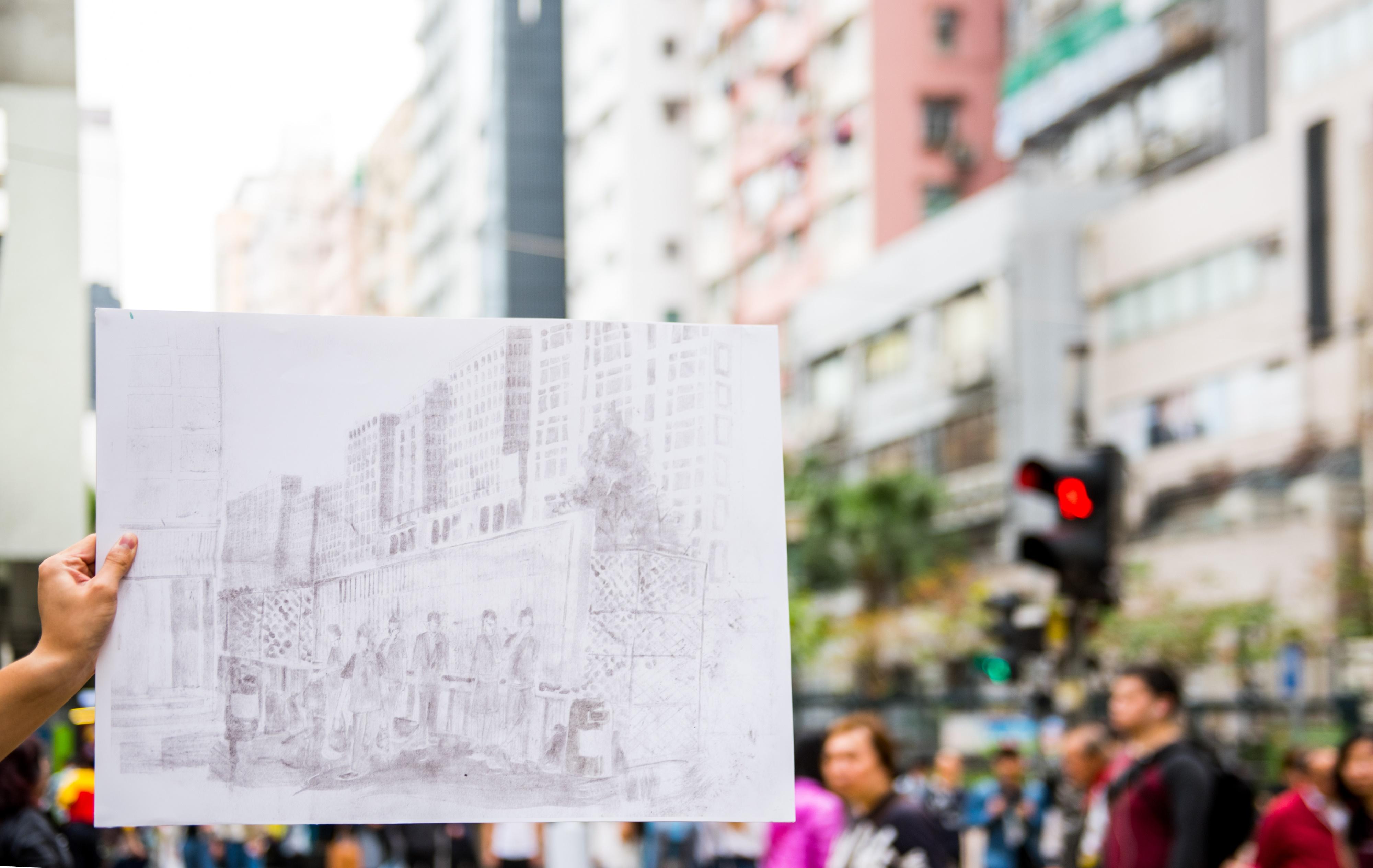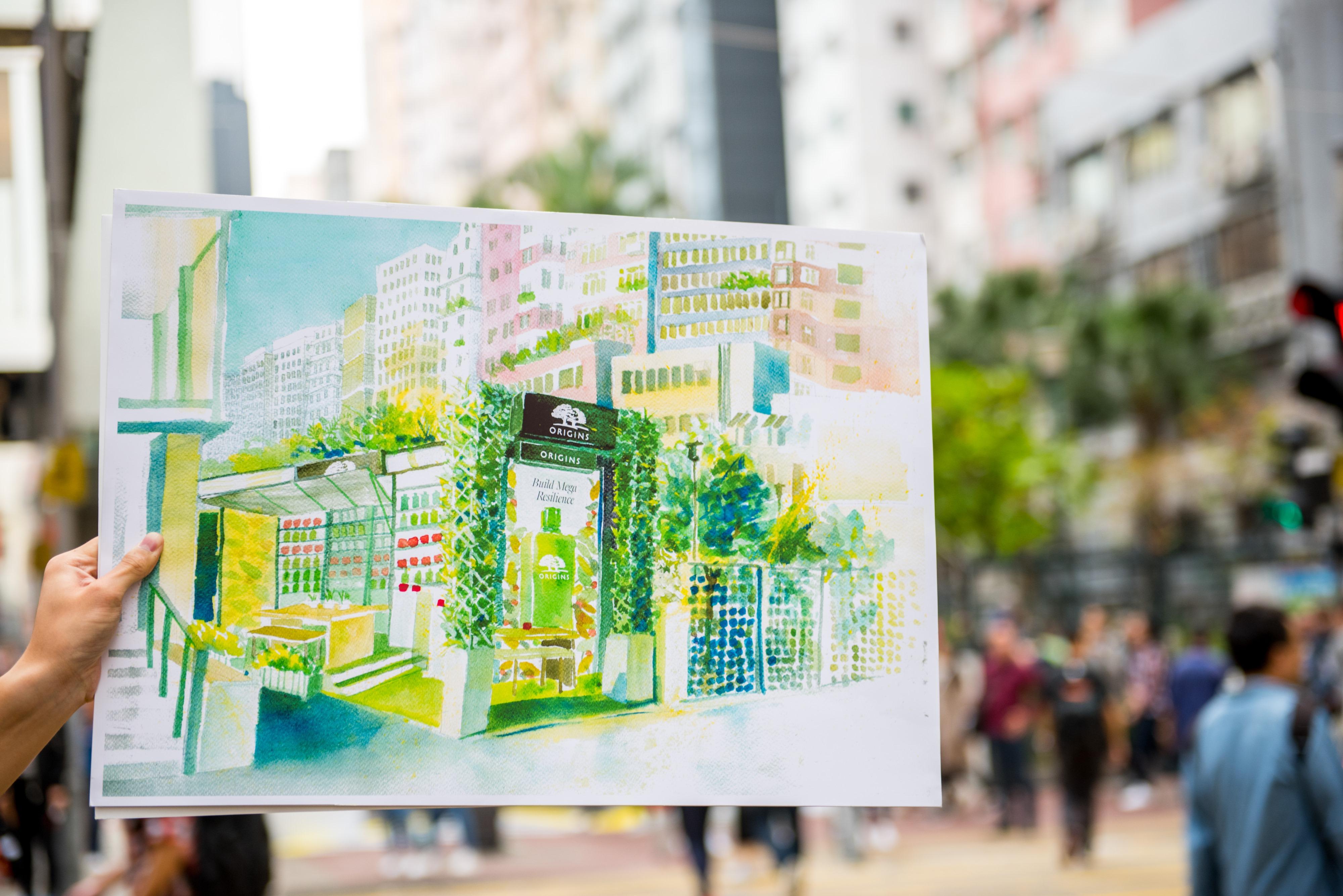 Origins 邀請本地人氣藝術家「飛天豬 Flyingpig」,用碳粉畫出心目中大眾對繁鬧旺角的印象,以及利用水粉彩於同一位置畫出Origins Garden。