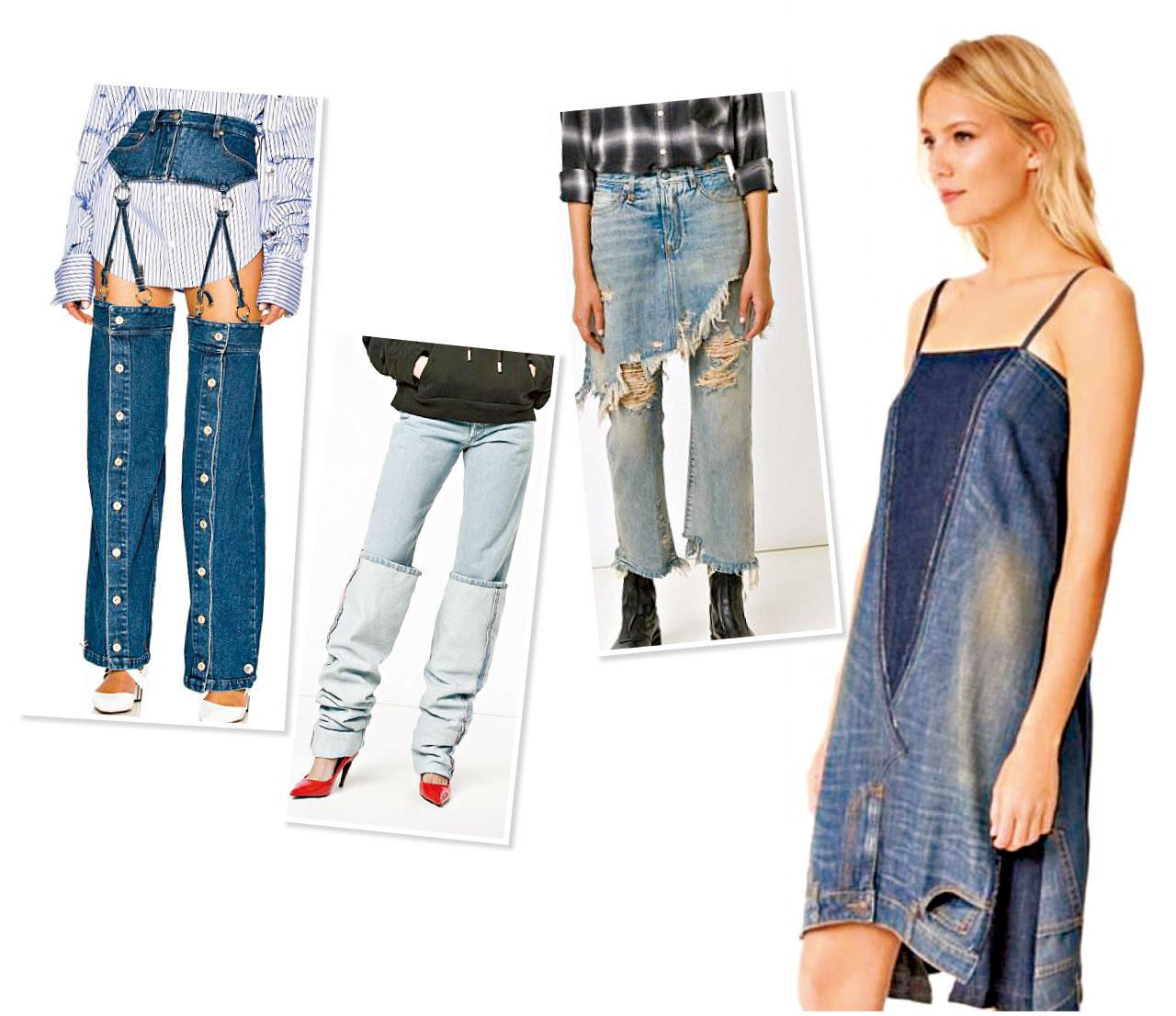 自從Topshop推出透明牛仔褲,石磨災難接踵而至,最新傑作是品牌「6397」驚嚇的孖牛裙,由兩條牛仔褲倒掛縫合(右),售約3,467港元更加驚慄。其他別出心裁之作,穿者勇氣確可嘉。(互聯網)