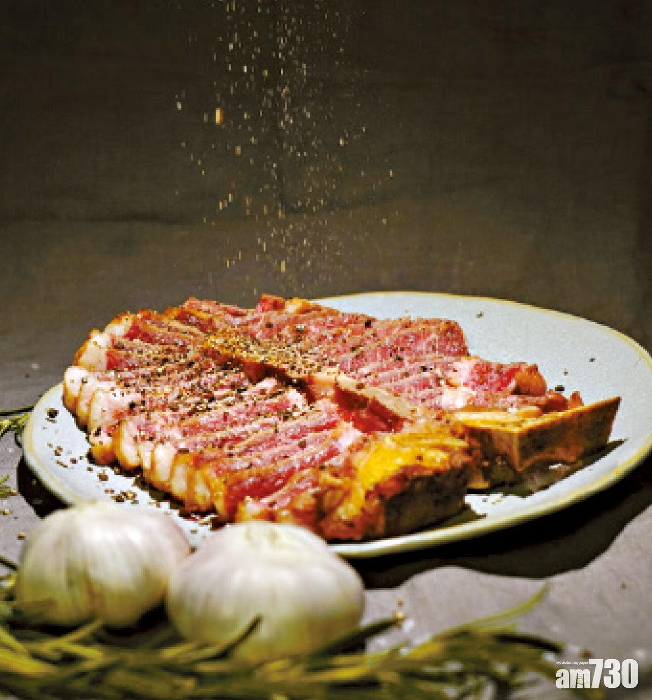 USDA Prime美國特級T骨扒,包含1/3頂級西冷及1/3牛柳,餐廳先將T骨扒輕輕燒至兩成熟,燒至表面輕微焦糖化,切割後客人再自行燒製。