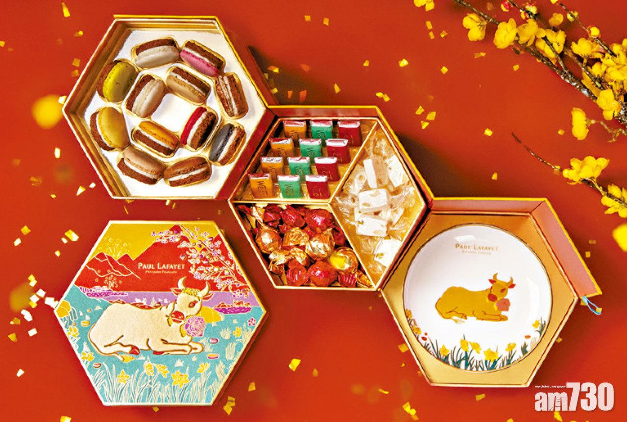 法式甜點品牌Paul Lafayet與合作無間的插畫師Emilie Sarnel設計出六角形三層賀年禮盒,寓意「三三不盡,六六無窮」。幽幽山巒下,金牛優悠地躺於法式馬卡龍樹下的水仙林中,禮盒以紅、黃、粉紅及粉綠色為主,非常搶眼。第一層為全新甜品「Cookiron」,結合創辦人Toni Younes兒時最愛的朱古力曲奇及品牌經典人氣甜點馬卡龍,並以香甜的馬達加斯加雲呢拿忌廉作餡;第二層放上三款法國精緻糖果,包括Weiss精選朱古力、牛奶榛子朱古力以及開心果杏仁鳥結糖;打開最底層為金邊陶瓷圓碟,造工精美,另每盒贈送限量版利是封一份(一套10個),送完即止。
