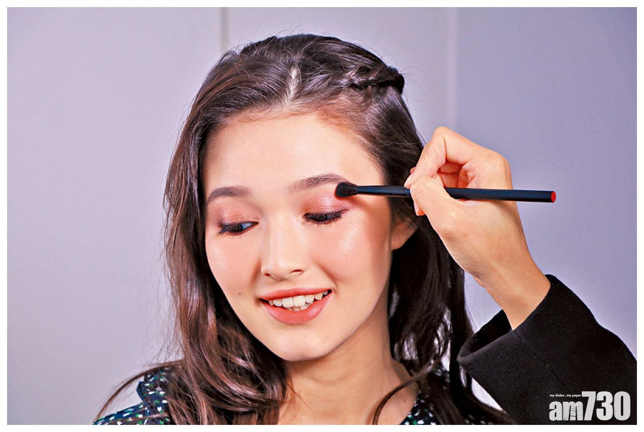 Step 1 眼影組合以溫暖自然色調為主,先用閃爍淺褐色在整個眼窩打底,眼頭位置用上閃爍金色提亮。