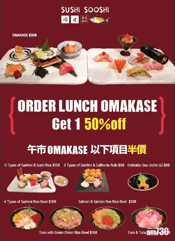 主打精品立食壽司的SUSHI SOOSHI(鮨廷),由即日(3月8日)起推出午市50% off優惠,現有會員或即時成為會員,惠顧LUNCH OMAKASE ($358),均可以半價ORDER指定LUNCH SET, 而食客現在還可以坐住嘆SUSHI。