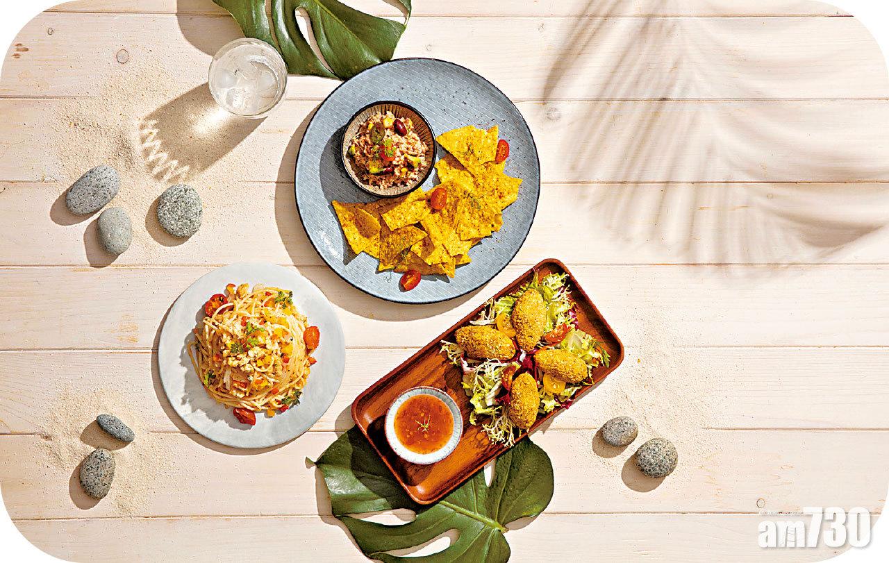 [右]扮曬蟹餅(植物蟹肉他他多士)、[上]新吞拿脆脆(新吞拿墨西哥粟米脆片)、[左]扮曬蟹意粉(意式香辣植物蟹肉意粉)。$72/$56/$79(Green Common分店獨家)