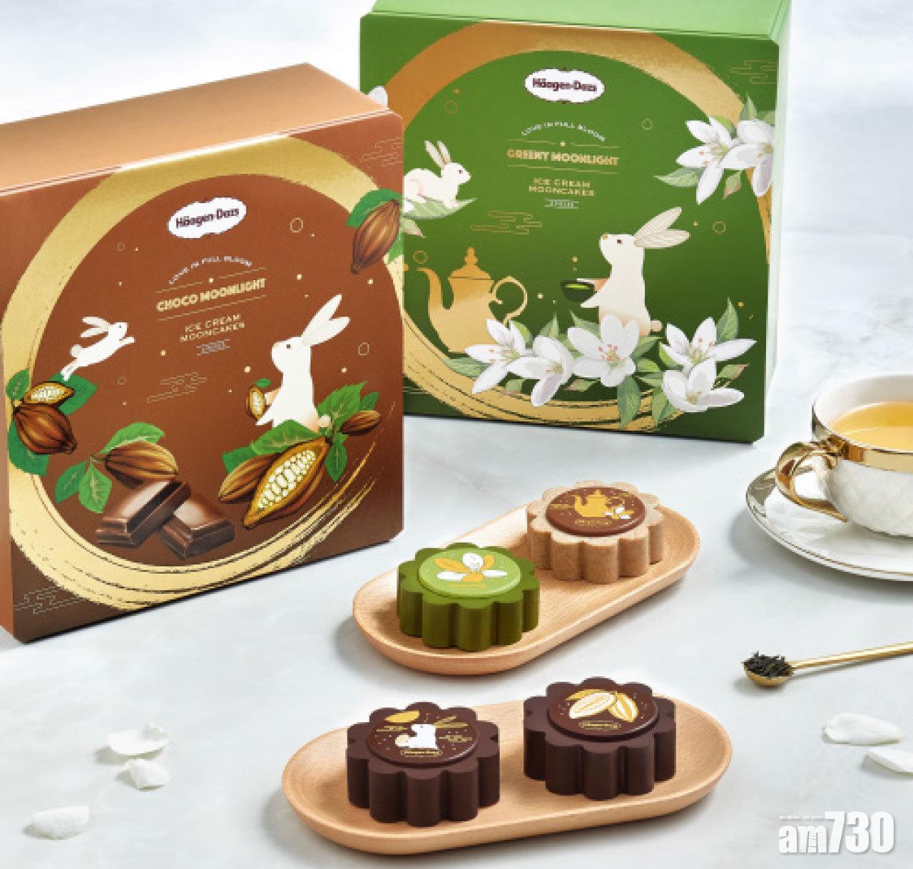 今年,Häagen-Dazs推出12款雪糕月餅,包裝設計用上淡金圓月,加以繁花及兔子作點綴,包括為一眾茶迷及朱古力控準備了兩款創新雪糕月餅,嚴選不同名茶產地茶粉製成朱古力脆皮外層的茶‧亮月(早鳥價$278)及搜羅知名產地及不同濃度的朱古力打造脆皮包裹朱古力雪糕的醇‧伴月(早鳥價$278)。