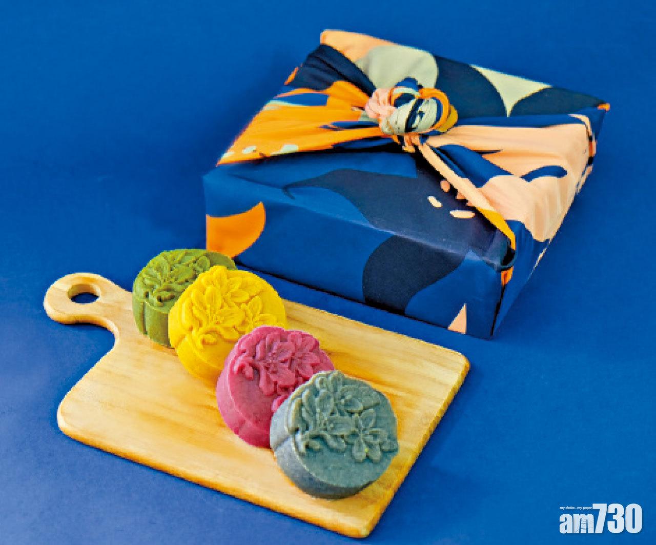 The Cakery以優雅的木盒包裝加上經典的藍色圍巾,打造出一份優雅感覺,四款以superfood炮製的「零罪惡感」月餅包括黑芝麻、紅棗果仁、水蜜桃烏龍茶及檸檬柚子,全部皆純素及無麩質。