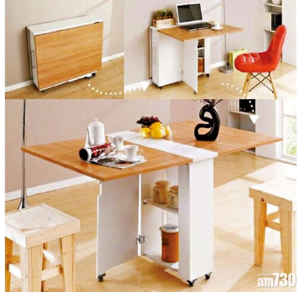 摺疊家具伸延空間:坊間有很多不同的時尚款式,Andy認為適當運用,可以令空間變得更多用途,「例如連書架的掛牆枱,同一空間放張固定桌子影響生活動線,但在需要時才打開就可以帶來更多空間,但值得注意是不要擺放太多雜物,養成每次使用完摺起的習慣,才能發揮真正用途。」