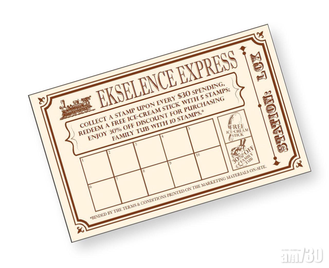 凡購物滿 $30,即可獲蓋印章一個;於Ekselence Express車票上集齊5個印章,即可免費換領Ekselence脆皮雪糕批一支;集齊10個印章,即可享有家庭裝雪糕七折優惠。