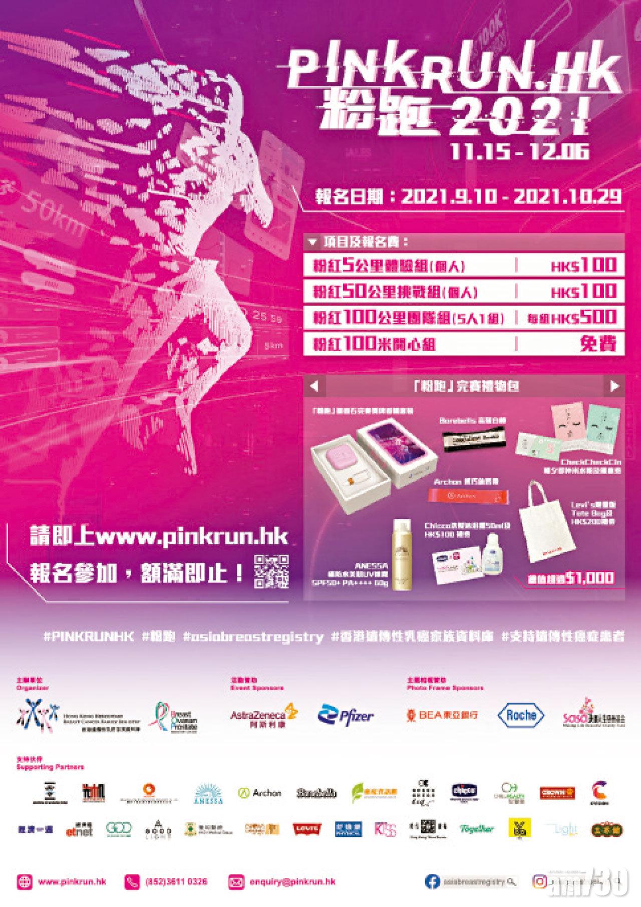由香港遺傳性乳癌家族資料庫舉辦的年度盛事《粉跑PINK RUN.HK 2021》,結合線上線下舉行,今年增加全新項目「粉紅100公里團隊跑」,讓大家自行組成5人小隊、共同完成100公里賽事。至於其他賽事參賽者必須於10月29日或之前報名,並於11月15日至12月6日內,以「Pink Run」手機應用程式參賽、記錄及上傳成績,以換取總值超過港幣1,000元的限量「粉跑」完賽禮物包。