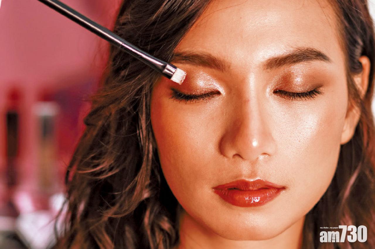 Step 1 眼妝方面,先以香檳金顏色打底,並以深啡色眼影在近睫毛位作眼線,並以偏白的單色眼影,在眼球中間位置作highlight。