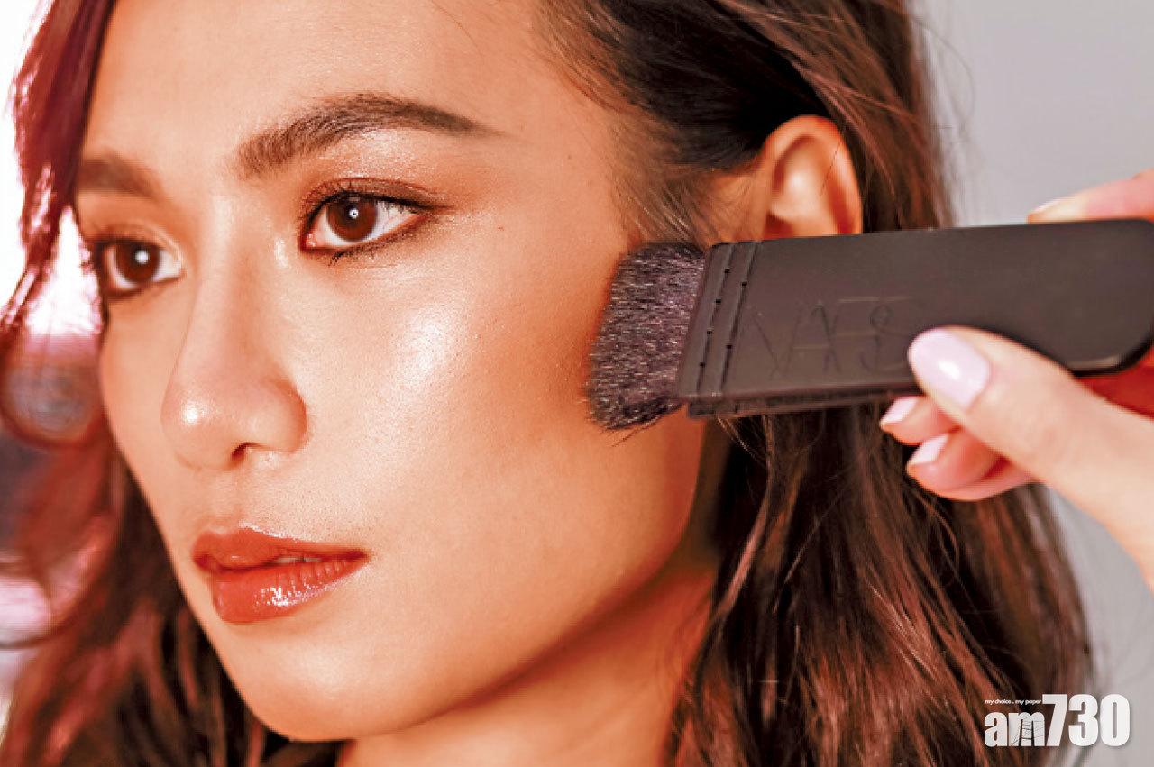 Step 2 先以bronzing liquid打底,再在顴骨、下巴掃上閃爍古銅粉。如果夏天著小背心,記得同樣在在頸、鎖骨及耳仔等位置掃上,避免出現鴛鴦色。