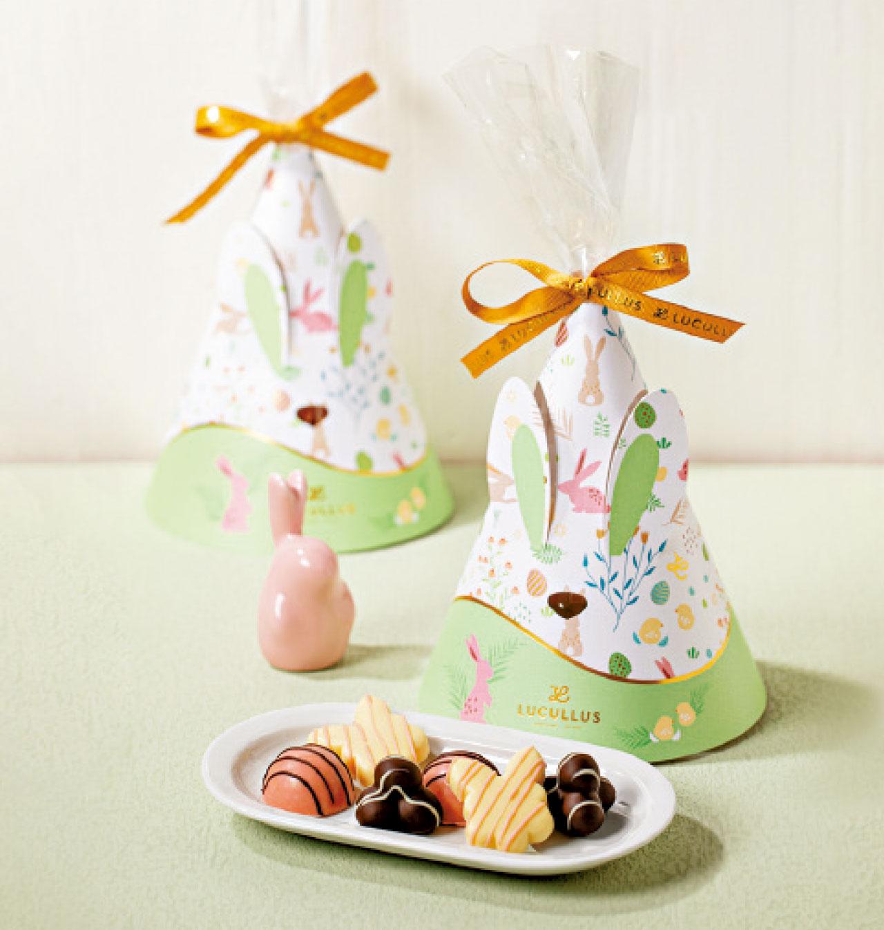 LUCULLUS小兔造型復活節朱古力禮包,外型可愛,內有全新限定白兔造型朱古力、士多啤梨朱古力脆米及龍島的經典原粒榛子純黑朱古力各兩件,外層包裝錐形硬卡紙更有立體剪紙兔耳朵,不妨廢物利用當作應節帽子!由即日起復活節系列產品有八折優惠。