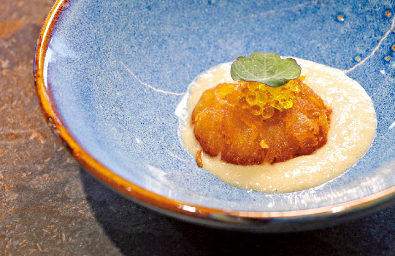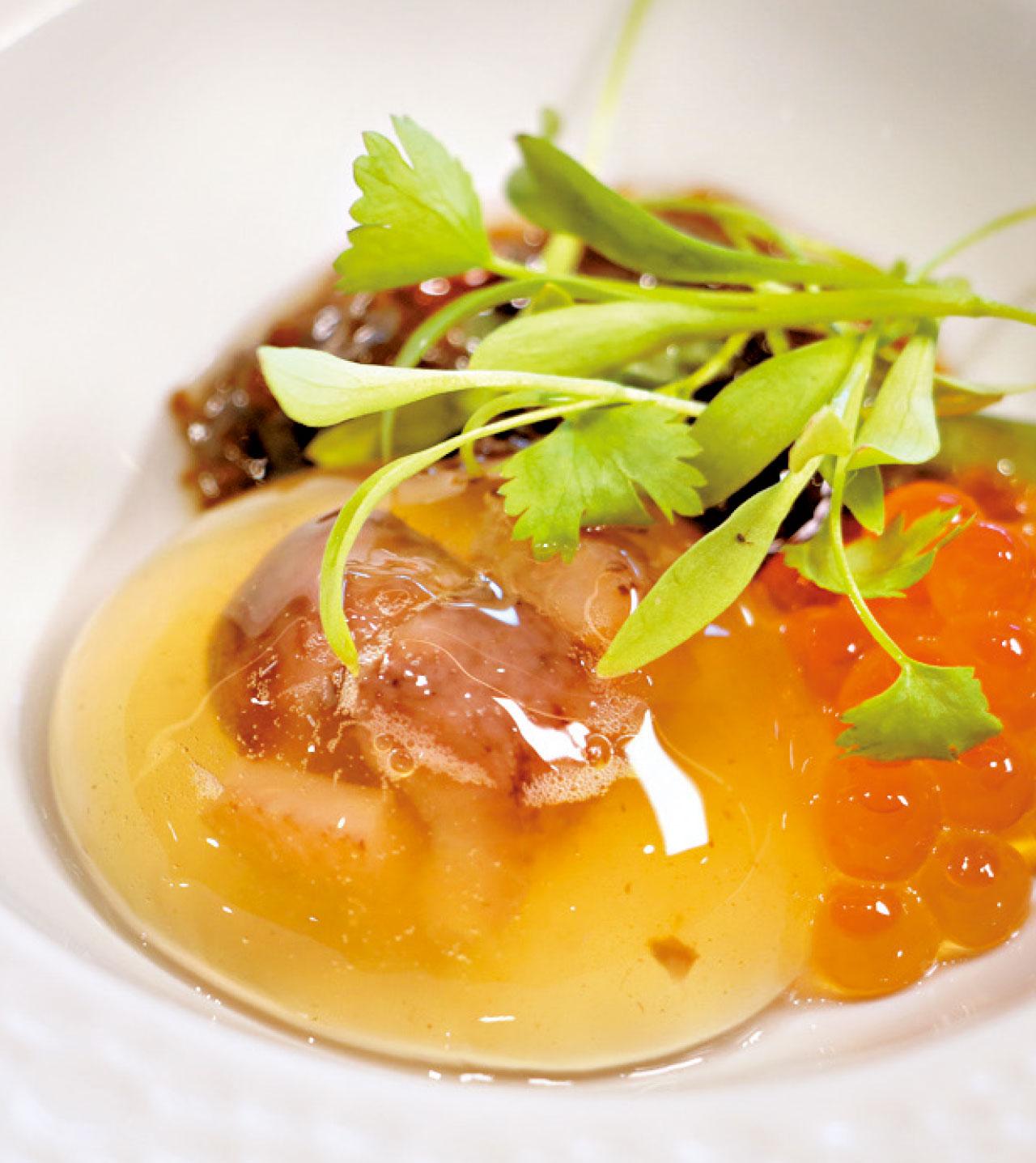 Thomas設的菜式不囿於煮法上,分子料理、現今法式常用的Espuma泡末等等都用上不少。新店再加強利用傳統中菜的鮑參翅肚,雖然總廚沒有做過中國菜,但勝在家族背景加上長於香港,對粵菜食材也有一定理解。在鮑參翅肚菜式中,最驚喜的是花膠菜式,用上冷泡浸發花膠,不止為了保留最多的膠質,更令口感十分軟糯鬆軟又勁黏口,配上以蟹肉造成的濃湯,味極好,又與粵式煮法感覺大不同。