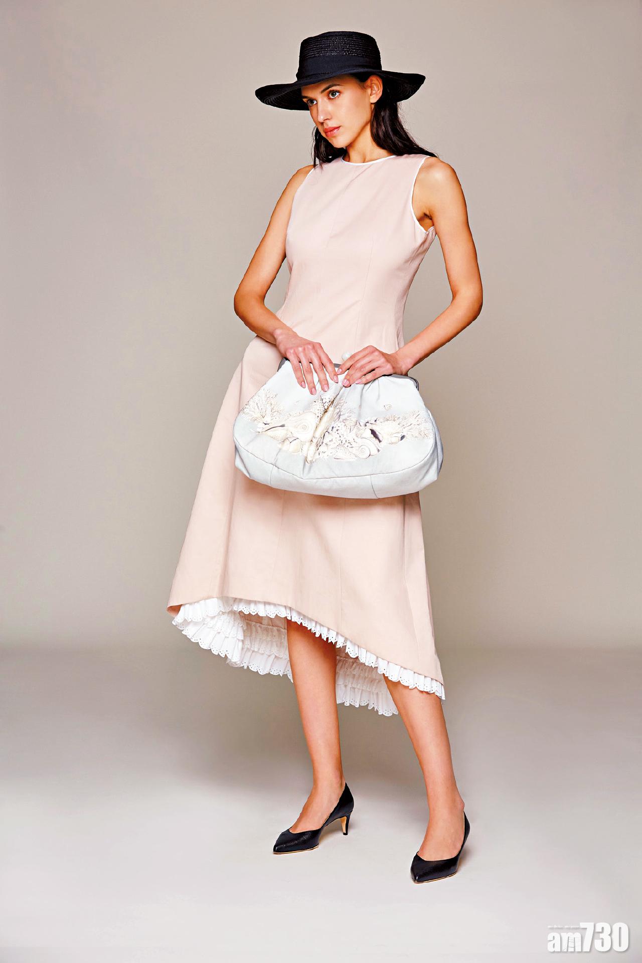 裸色綴花邊連身背心裙 $6,280 (c); 黑色闊邊草帽 $980 (c); 黑色尖頭高跟鞋 $2,480 (c); 粉藍色印花clutch bag $3,380 (c)