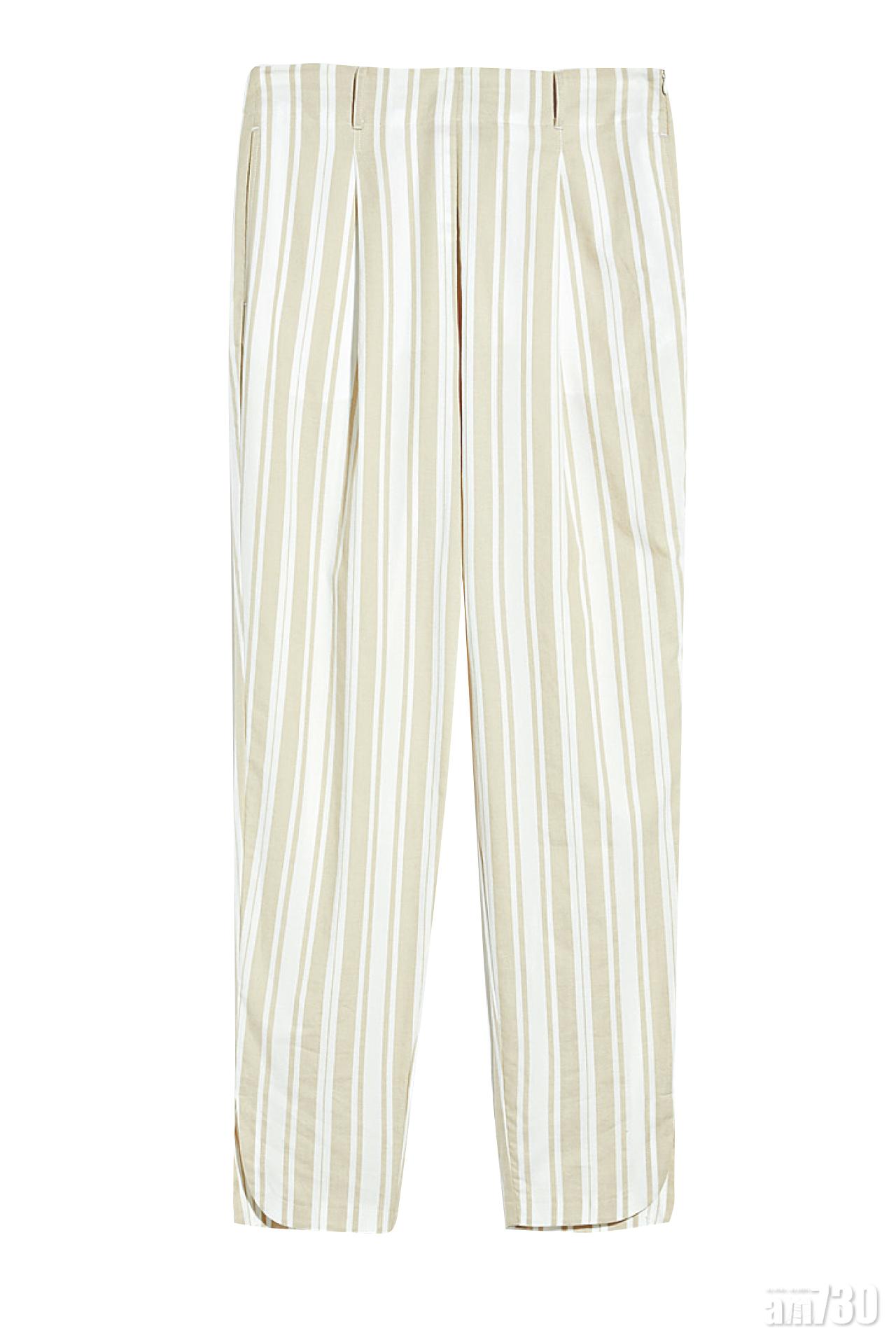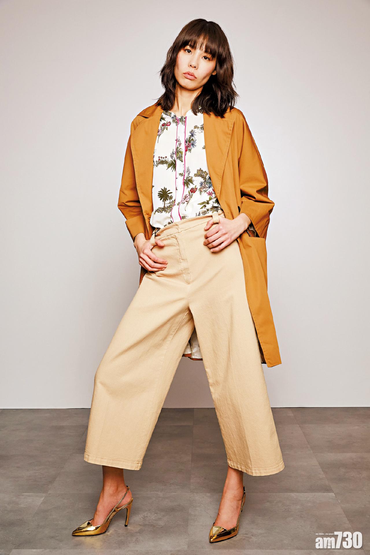 泥黃色trench coat $5,280 (b); 雪紡印花上衣 $2,680 (b); 杏色7分闊褲 $1,880 (b); 金色尖頭高跟涼鞋 $2,280 (b)