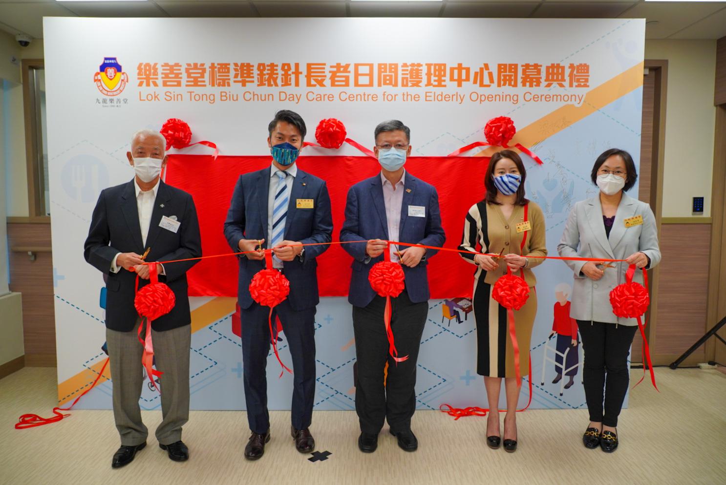 主禮嘉賓社會福利署梁松泰署長(中)、命名贊助人樂善堂莫文韜副主席(左二)、樂善堂温文蕙副主席(右一)、標準錶針及配件廠有限公司莫耀強董事長(左一)及劉愛詩總幹事(右一)一同為「樂善堂標準錶針長者日間護理中心」進行剪綵儀式。