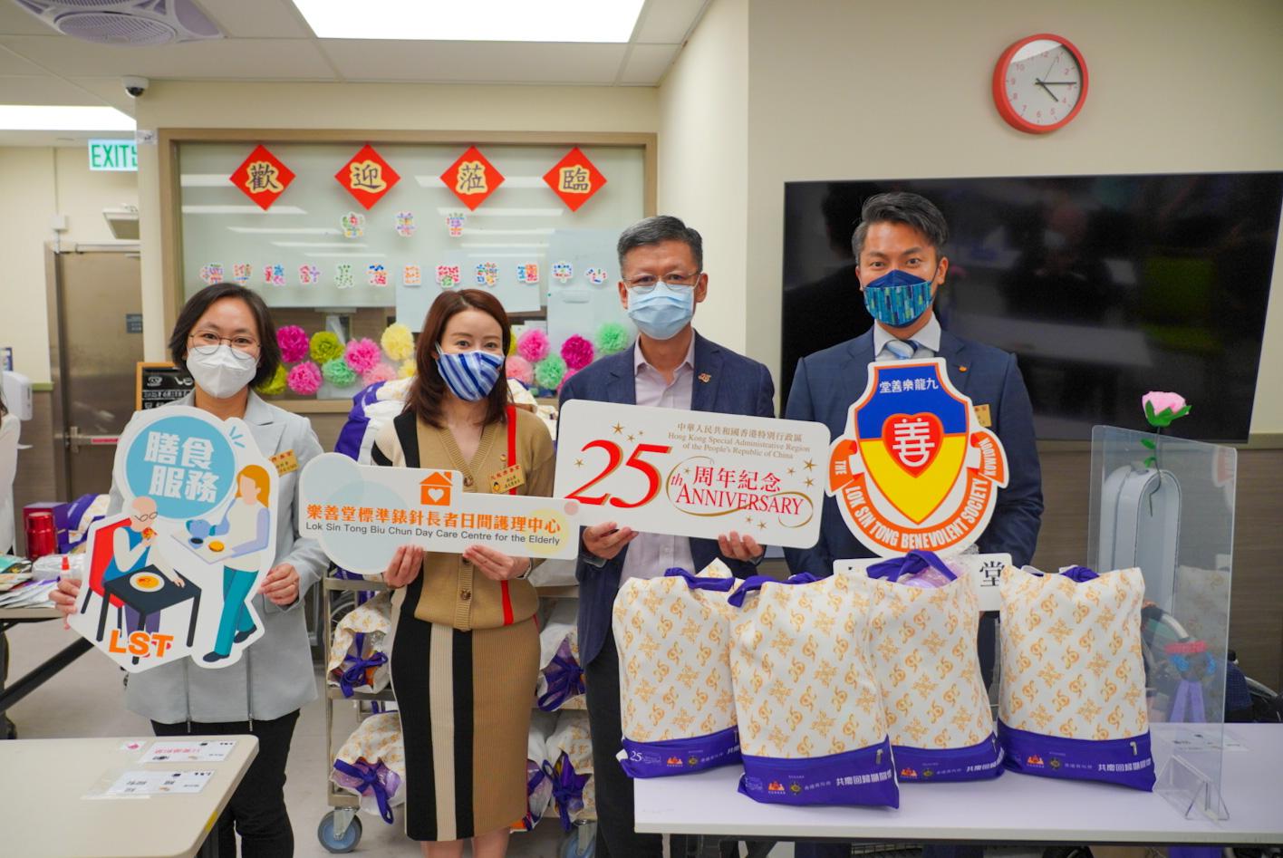 眾嘉賓一同派發「特區政府慶回歸25周年禮物包」予中心長者