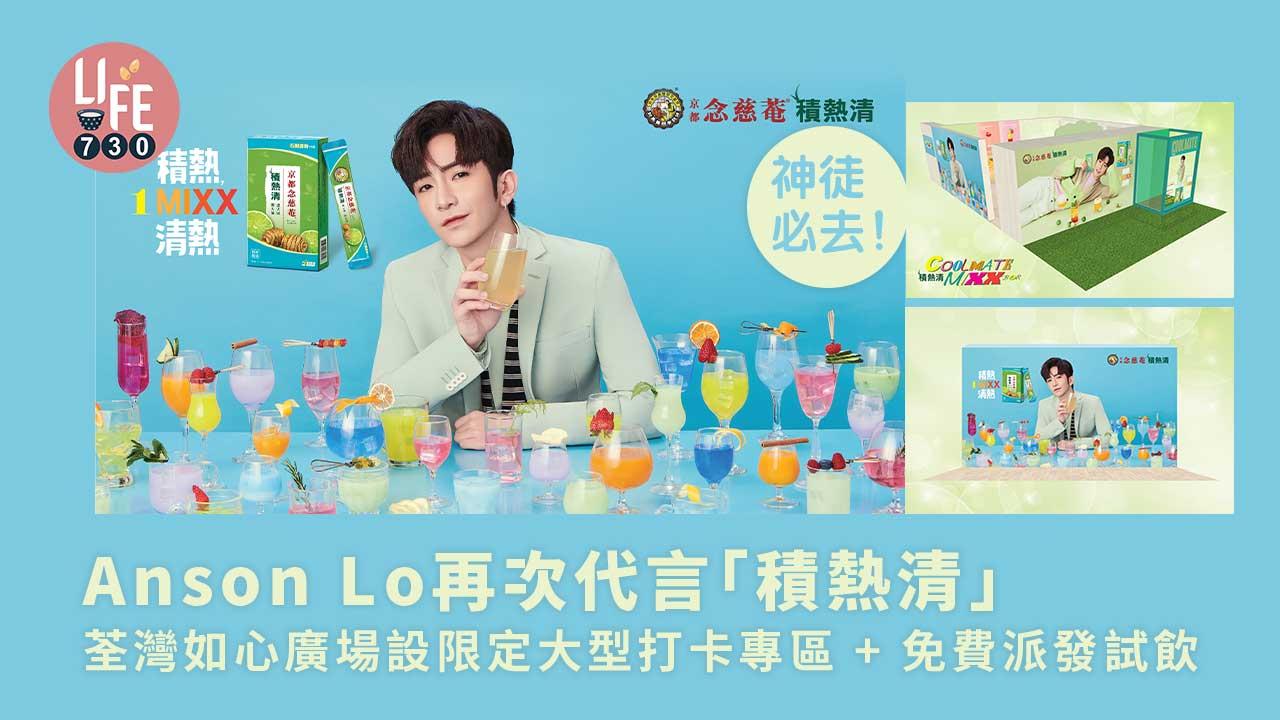 京都念慈菴今年再次找來Anson Lo盧瀚霆擔任「積熱清」代言人,拍攝全新廣告。在7月8至17日期間更於荃灣如心廣場一期1/F中庭,特意打造「積熱清 COOLMATE MIXX BAR」。屆時,除了會派發沖製好的「積熱清」及聯乘冠軍級調酒大師Sonic Chan創作之「積熱清」特飲,場內更設有4大打卡「COOLMATE X ANSON LO & YOU」專區、以及由專業調酒師主理的「積熱清」特飲週末示範專場,於盛夏為大家消暑清熱!