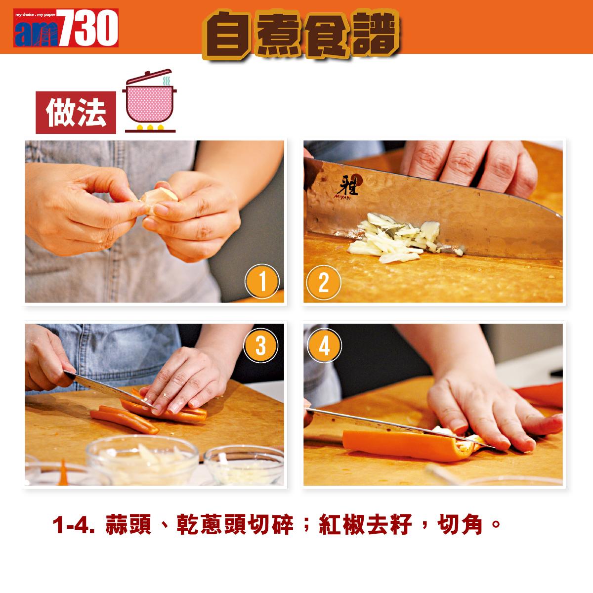 1-5. 蒜頭、乾蔥頭切碎;紅椒去籽,切角。