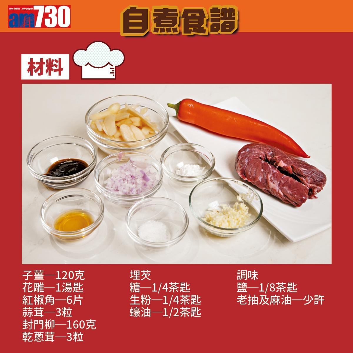 牛肉食譜│子薑炒封門柳材料(am730製圖)