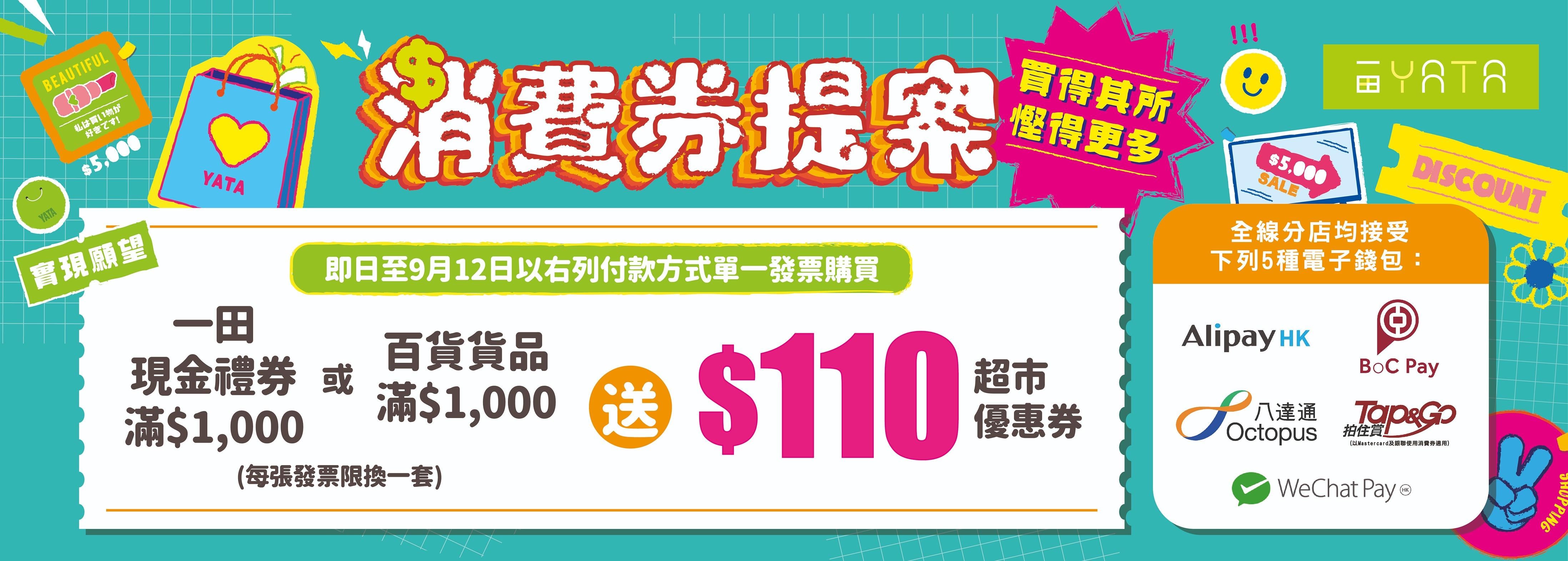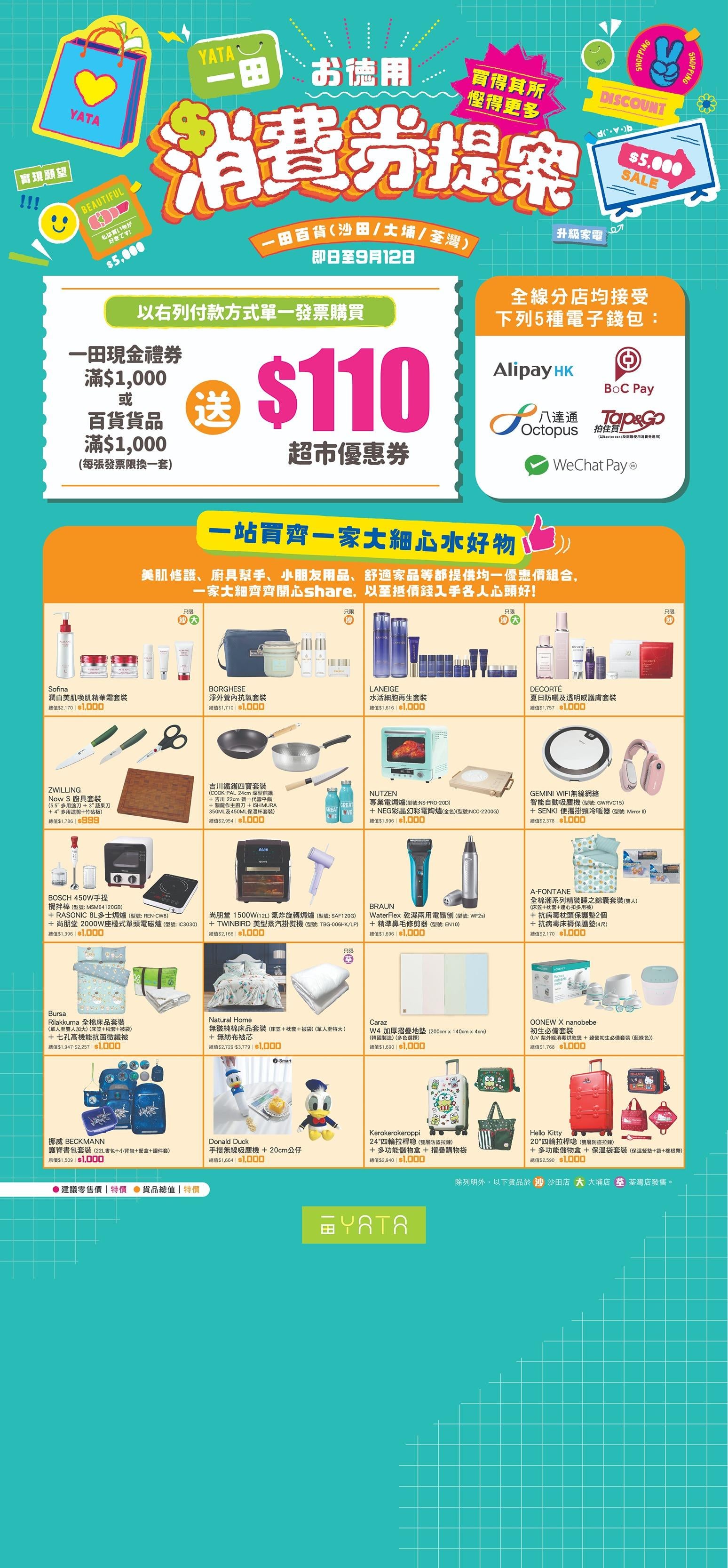 一田接受5大電子錢包付款,包括AlipayHK、BoC Pay、八達通、Tap&Go拍住賞及WeChatPay(HK),並由8月7日至9月12日更推出消費券提案,精選20款$1,000貨品組合,齊集廚具電器、化妝美肌、童嬰用品等低至3折,買精選組合同時更可換領$110現金優惠券。推廣期內即日單一發票購買一田現金禮券或百貨貨品滿$1,000,即可換領$110超市現金優惠券,數量有限,送完即止。