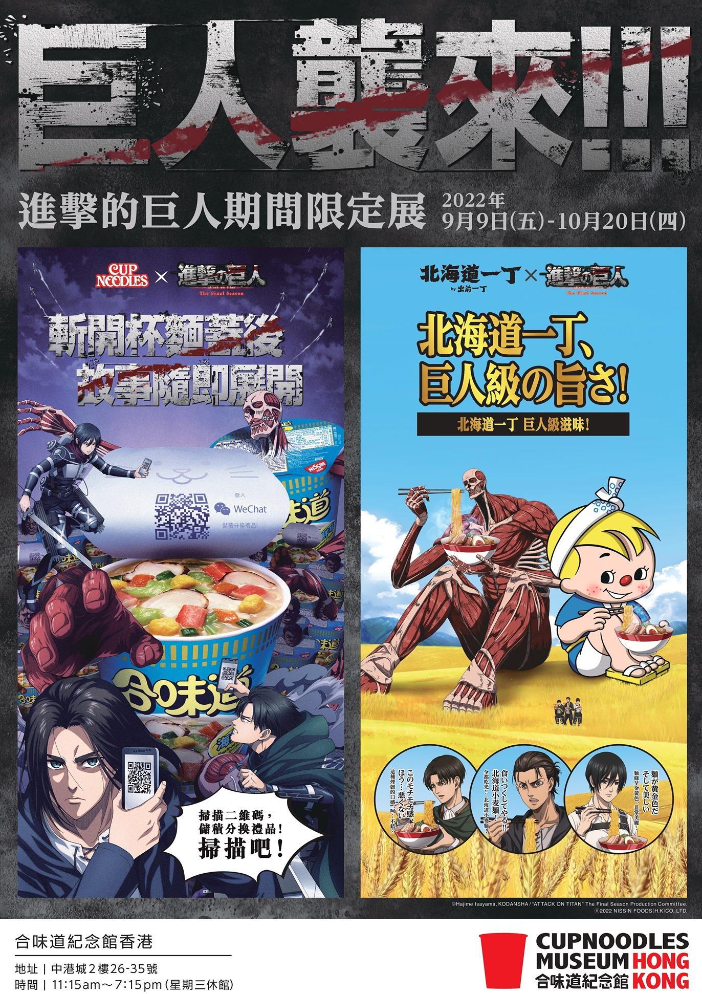 日清食品與人氣動畫《進擊的巨人》的聯乘活動再下一城,繼早前推出電視廣告,將於下月推出聯乘特別版包裝,一眾巨人及人氣角色更會於9月9日至10月20日期間「進擊」合味道紀念館香港,場內設有多個限定打卡熱點,為一眾動漫迷帶來打卡熱點。