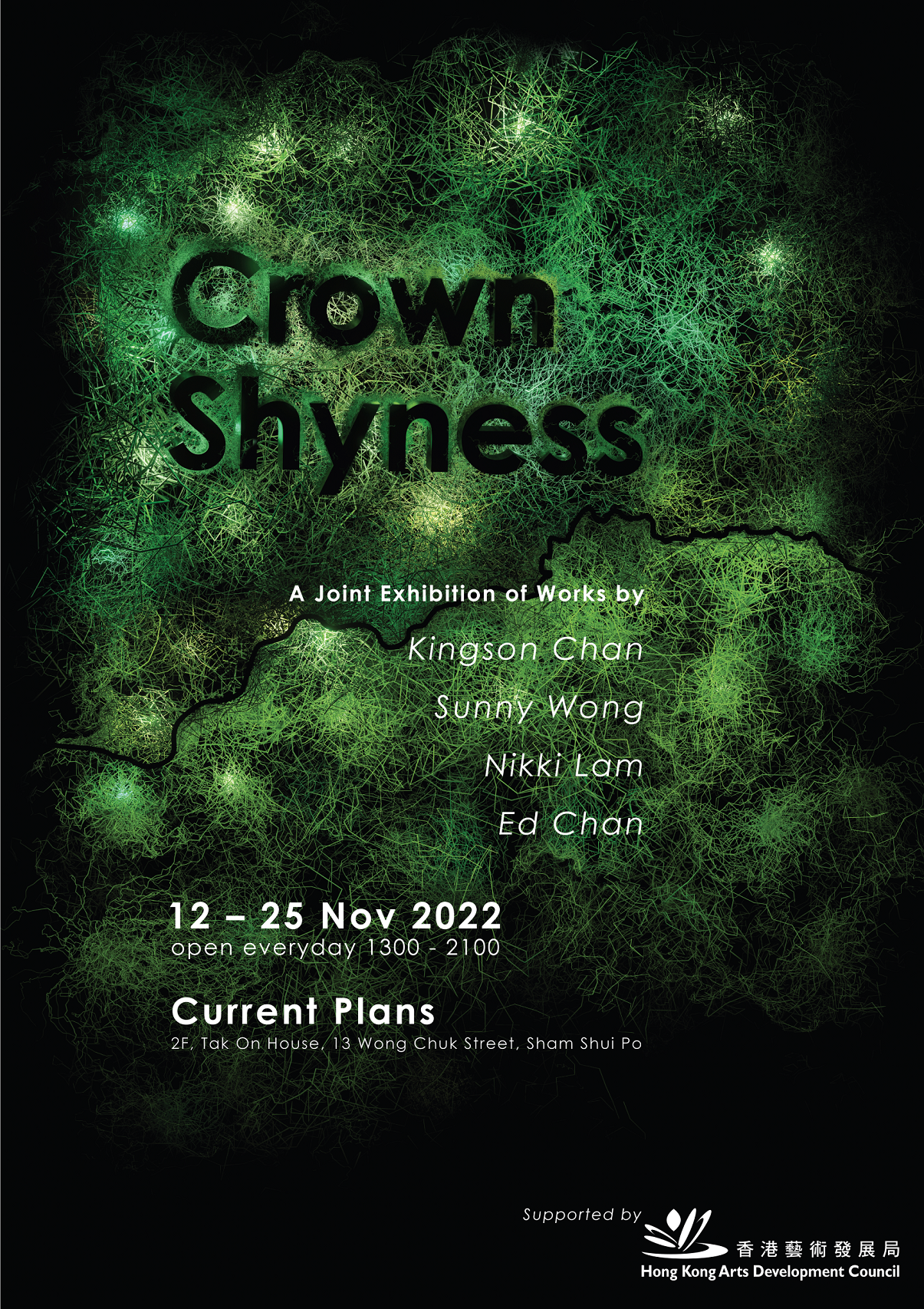 樹木之間原來有一個名為「樹冠羞避」(crown shyness)的現象。一些樹木的樹冠不會互相接觸,令樹冠與樹冠之間,形成儼如通道、運河般的間隙。這種現象自1920年代起受科學家討論,認為當中的原因包括,樹的葉尖因大風受損、相鄰植物互相感光,又或「樹冠羞避」可避免食葉昆蟲幼蟲從一棵樹蔓延至另一棵樹等。4位從事不同媒介的藝術家︰陳健聲(Kingson Chan)、黃永生(Sunny Wong)、林曉彤(Nikki Lam)及陳泳生(Ed Chan),以「樹冠羞避」為引子,創作出多個值得細味的作品。