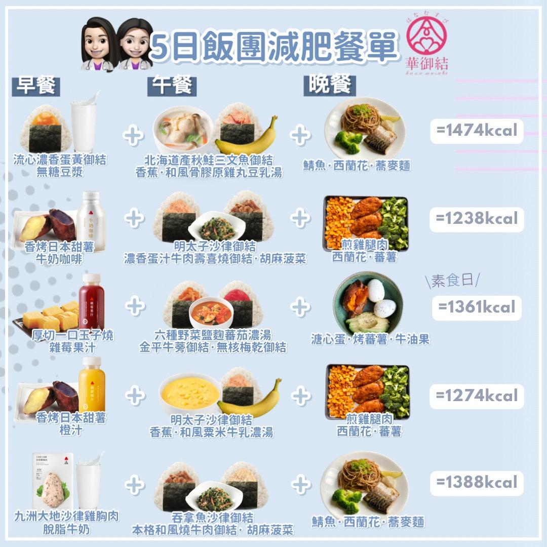 為實現御結減肥法,註冊營養師團隊安曼營養特別設計5日御結減肥餐單,當中推薦以華御結 100%日本米製作的「御結」為主搭配出一日三餐減重餐單,透過御結米飯產生抗性澱粉以燃 脂減重,既無需挨餓同時維持均衡營養吸收。餐單除了包含各款口味的御結,更加入全新升級 的日式自家製湯品,如高纖低卡的六種野菜鹽麴蕃茄濃湯,以及濃郁幼滑的和風骨膠原雞丸 3 豆乳湯,另有鹽味半熟溏心蛋、日本甜薯、胡麻菠菜等營養單品,絕對適合一眾上班族以豐富 多變的和式美食輕鬆達致控制體重的效果。