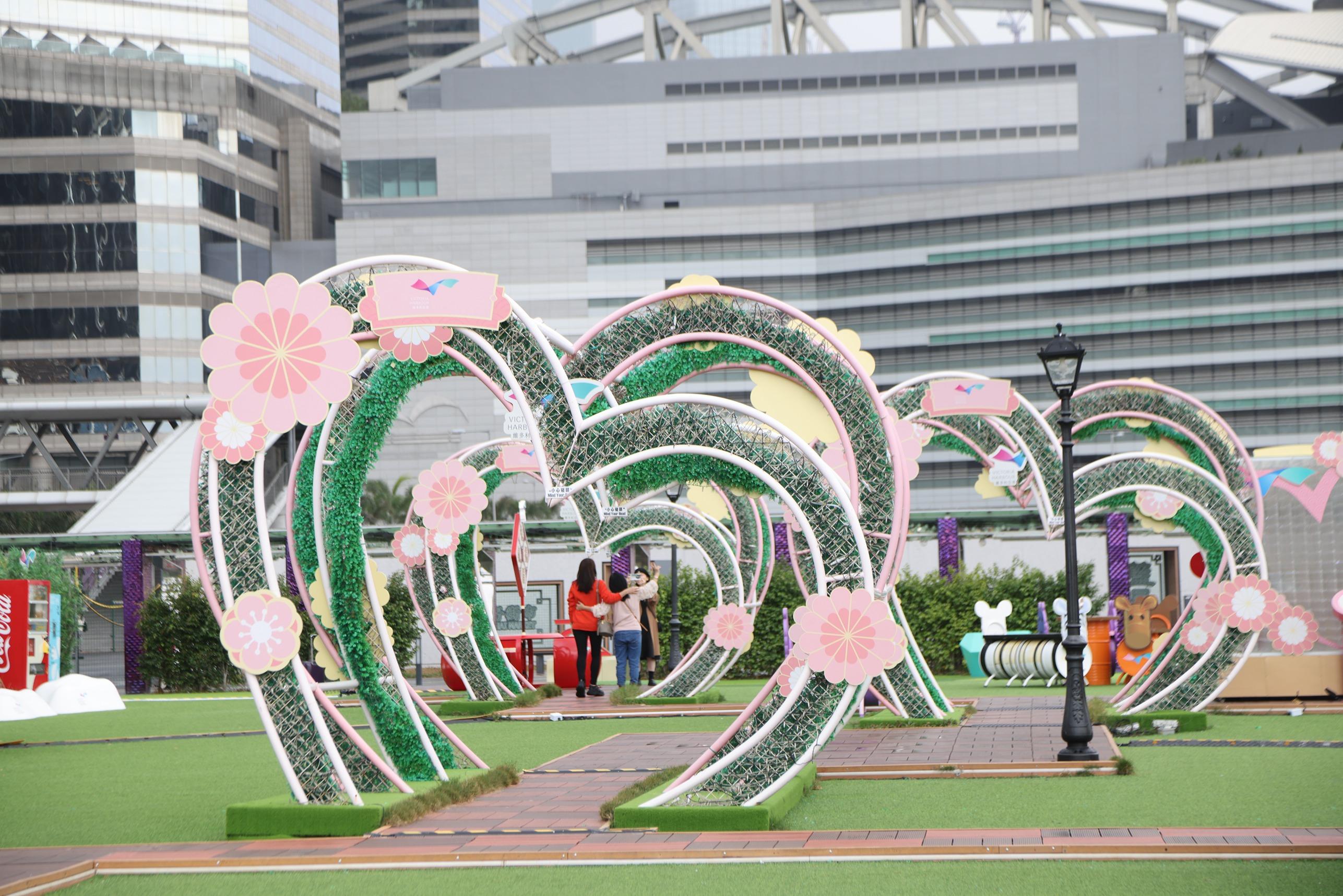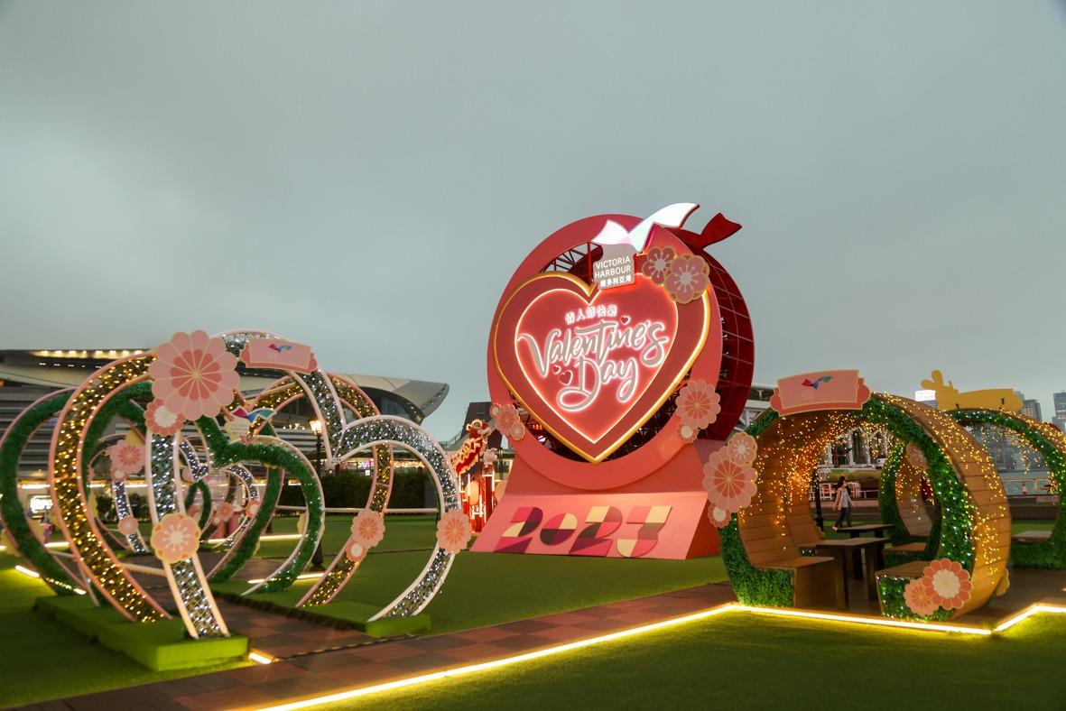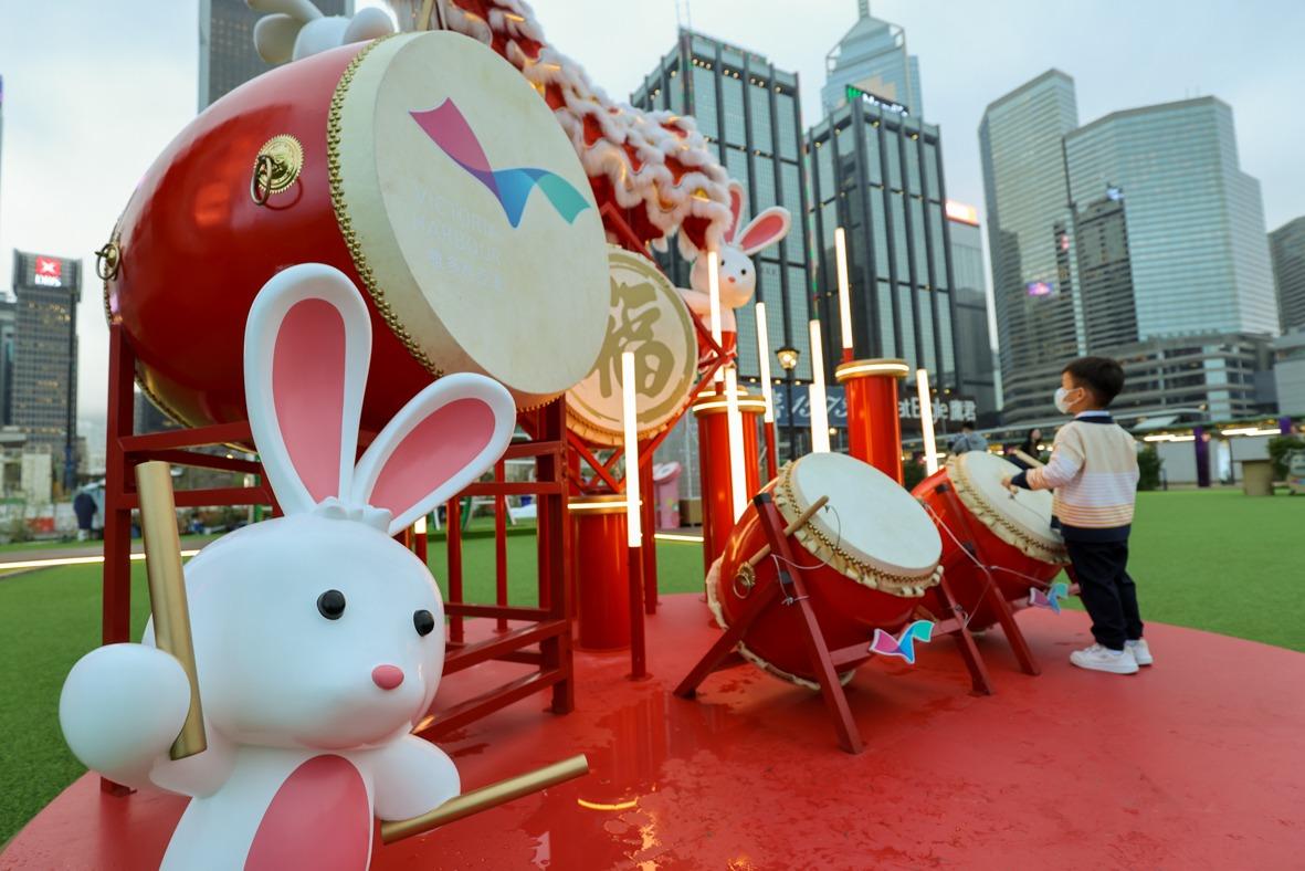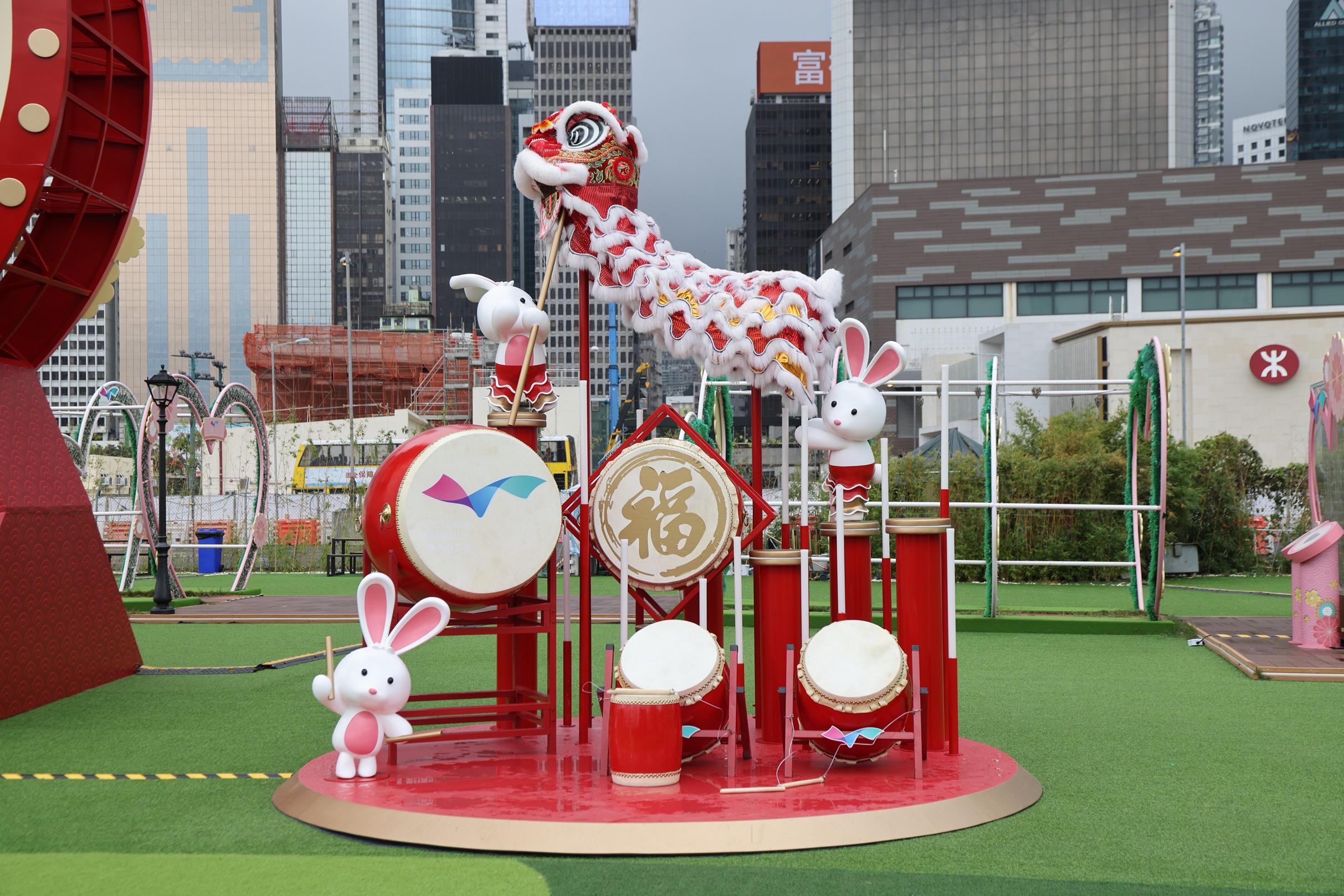 灣仔「HarbourChill海濱休閒站」以「吐(兔)氣揚眉」為主題,特設9米高雙面「LED燈箱大鼓」立體裝置,向維港的一面鼓身LED燈箱組成不同祝賀圖案,照亮維港兩岸,非常搶眼。大鼓旁邊更有數隻兔子在梅花樁上舞著醒獅,增添濃厚的農曆新年氣氛。「LED燈箱大鼓」的另一面則設計成巨型粉紅心心裝置,甜蜜感滿滿。旁邊亦設有一組互動裝置,二人只需各自把手輕按「心心相印心跳感應器」,心形透明裝置便會立即閃爍粉紅心心,傳情達意。場內更設有其他新春裝飾,為大家送上新年祝福。