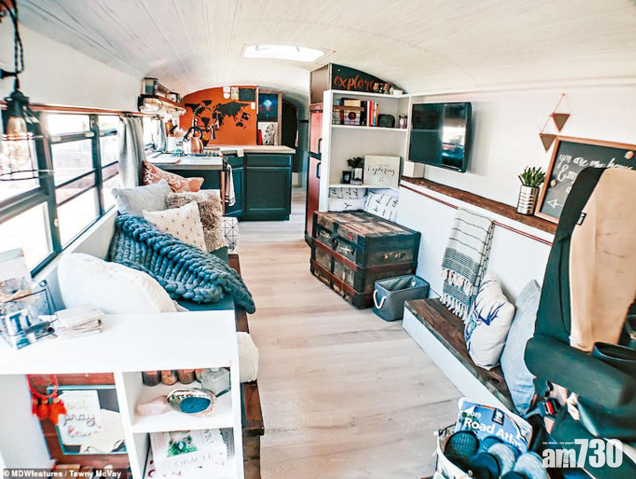 來自美國、追求戶外生活的34歲Tawny McVay,跟31歲丈夫Michael毅然放棄三層高的獨立屋、座駕及健身室生意,帶著兩個子女,在一架舊校巴內生活,展開自由自在的旅行車生涯。他們以3,900英鎊(約4萬港元)買入校巴,另用11,700英鎊(約12萬港元)將它大翻身變成「豪宅」,裡面浴室、gas爐、廚房、雪櫃、洗衣乾衣機,一應俱全,它靠太陽能及大容量電池發電。目前他們已橫跨行了太平洋西北地區、蒙大拿、愛達荷州、懷俄明州,共5,000英哩,更打算到美國西南部過冬。