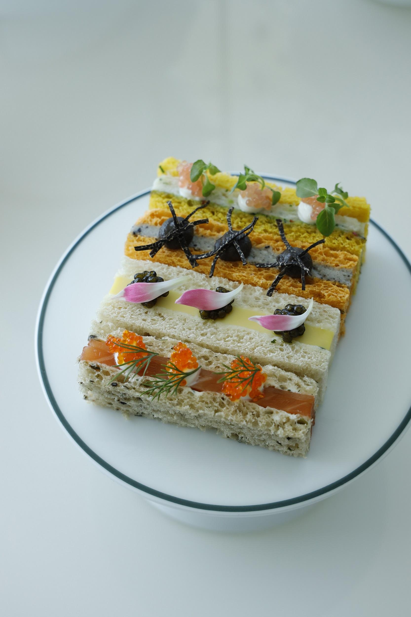 大堂酒廊供應的下午茶每天供應。餐牌上少有的沒有太多資料,其實是有特別原因的。由於蛋糕與點心大多依照季節時令製作,糕餅款式亦是輪流供應。鹹點中的三文治以矮架盛載,三文治切的方正,由麵包到餡料都是自家製作,款式包括「地中海藍蟹肉配檸檬麵包」、「番茄麵包配松露芝士與黑松露」與及「海苔麵包配三文魚、蒔蘿及三文魚籽」。最出色的一款是「和風雞蛋三文治」,主廚將蛋白與蛋黃分開,製作蛋白霜後與蛋黃混合再烤製成為厚蛋餡料,以軟包製作成為入口豐富的「Egg Sando」。