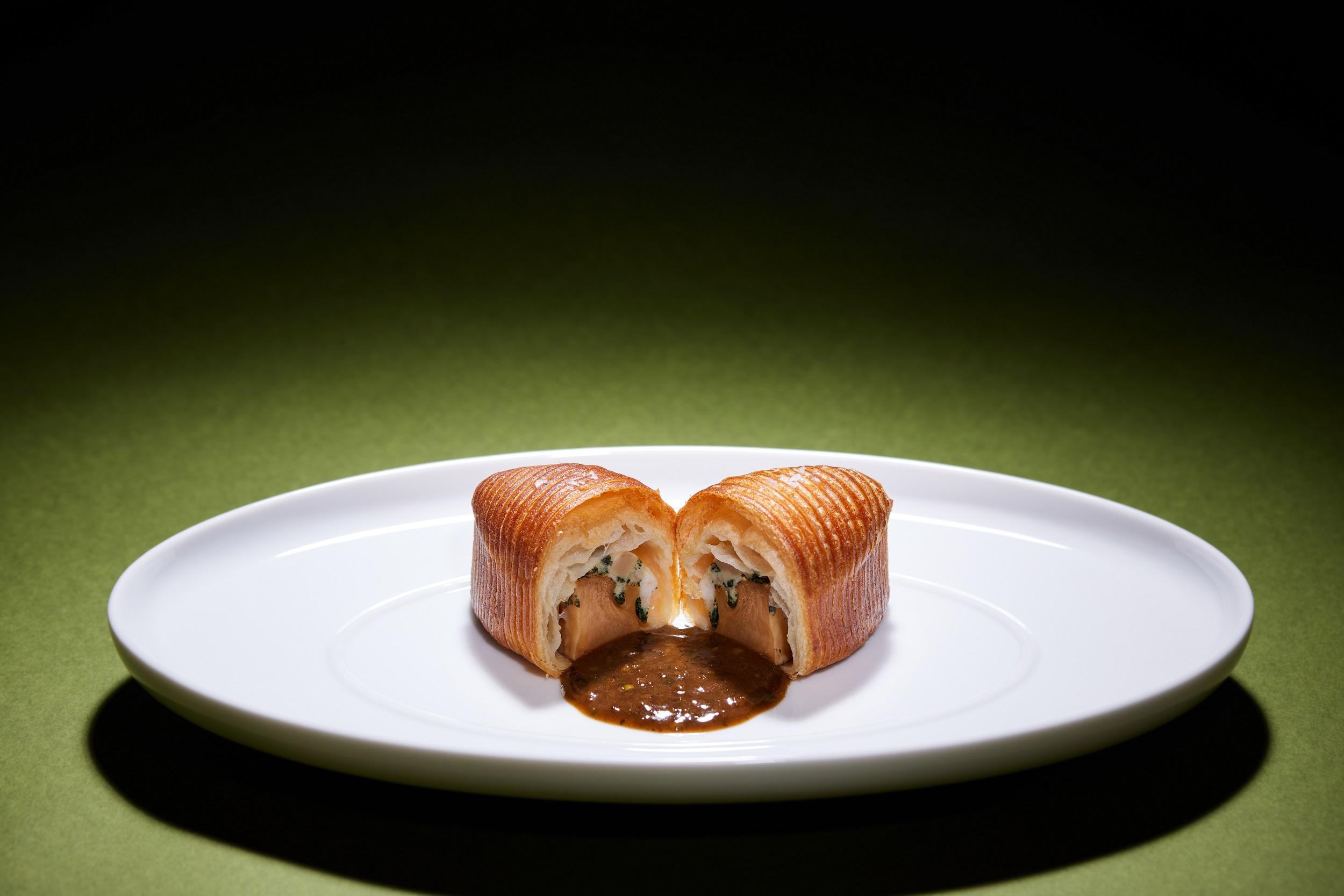 整個12道菜單不少菜都吃得大家嘩聲叫好,不過要數完成度最高的是川椒威靈頓鮑魚,好吃得來又體現了中西合璧的一道菜必數川椒威靈頓鮑魚,這道菜由范主廚執行完成,江大師試了一次便發辦可推出,近年不少中菜都愛加入酥皮的菜式,但效果不一定好。而這裡的不但酥皮做出了三層口感,鬆、脆中帶軟,而菠菜蝦肉內包著的扣得軟腍的鮑魚,不但能夠輕易咬開而不會與鬆皮分得四散,而且保有軟糯口感,最重要是汁醬以川椒及胡椒加上純鮑汁,再以少許牛油推成,汁醬的中味西體與威靈頓極配合,吃落每樣口感與味道也熟悉,但就是驚喜的好吃。這個高潮菜式後,酸菜邊魚腩是江大師最喜歡的一道,近年單是酸菜魚就在香港不少中餐中出現,這裡的版本用上長江的邊魚魚腩,魚肉彈牙,好吃在配上了烤香的葱及微辣鹹香的欖角酸菜末,當然,濃郁而味道細膩的酸菜魚湯也是主角,這菜厲害在魚湯的鮮酸香味能將還停在威靈頓鮑魚的震撼中的我帶回這道菜中。整個菜單,好玩好吃的重點很多,不知不覺便吃了五小時。