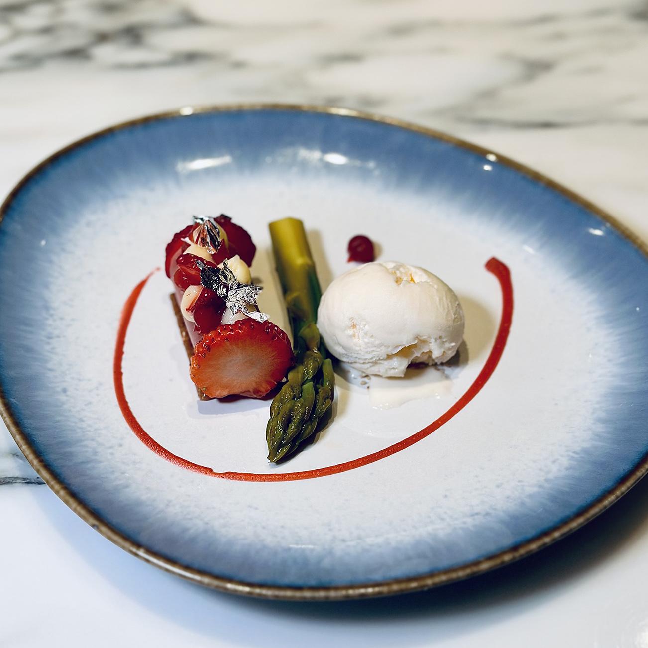 另一款法式白醬燉雞配青豆及蘆筍時蔬,頗適合食肉獸,啖啖雞肉再配薯蓉,飽肚之選;甜品有糖漬士多啤梨榛果蛋糕配青豆雪糕。