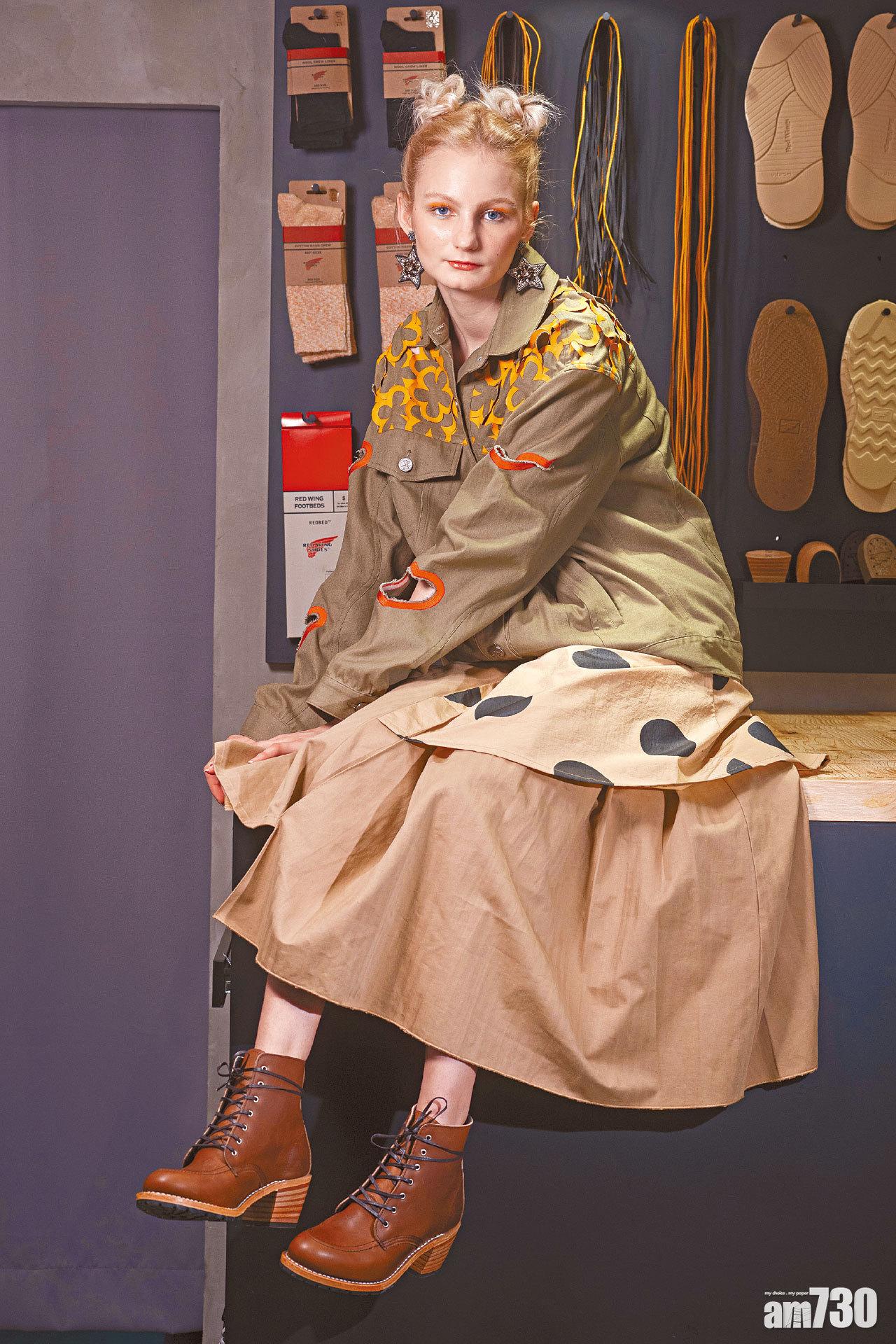 啡色Clara boots (Style No.3406) $3,299 (a); 軍綠綴立體橙花外套 $1,980 (c); 杏色綴大波點及紅格仔半截裙 $1,309 (c); 黑色閃石、珠仔星星耳環 $170 (f)