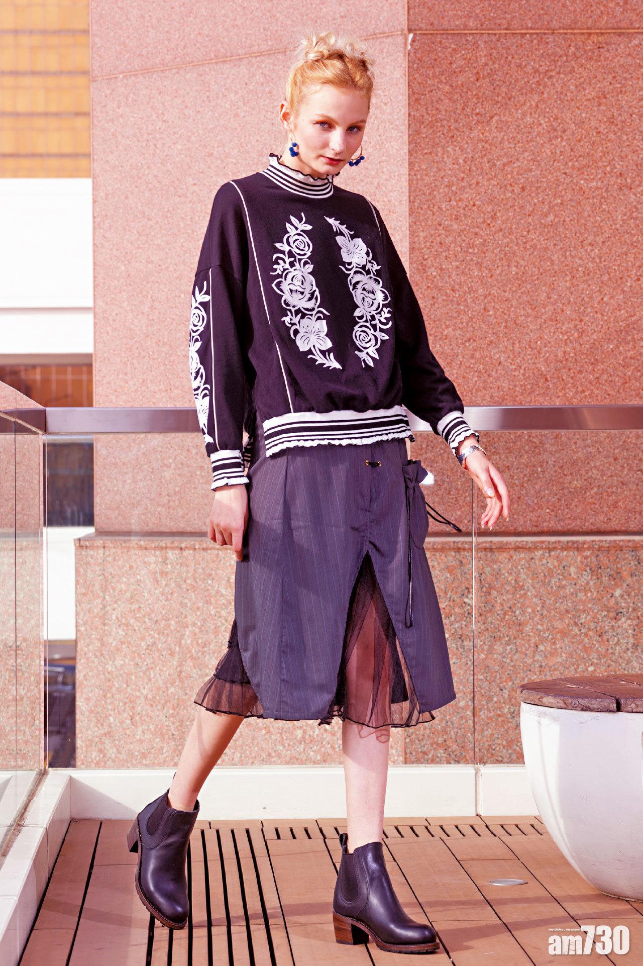 黑色Harriet boots (Style No. 3473) $3,299 (a); 黑白印花上衣 $980 (c); 灰色條子綴紗紗半截裙 $1,780 (c); 銀色粗手鈪 $112 (f); 彩藍波波大圈耳環 $112 (f)