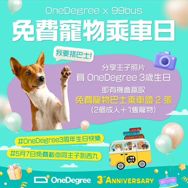 OneDegree宣布將於5月7日聯同香港寵物巴士組織99Bus狗狗巴士舉行「OneDegree免費寵物乘車日」。