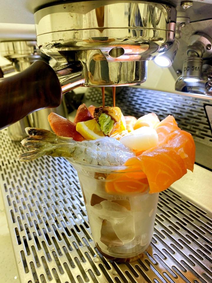 以圖中的刺身咖啡為例,海蝦、帆立貝及三文魚在濃縮咖啡液的沖泡下被燙至半生熟,在室溫的環境需要盡快飲用,否則就會產生食品安全問題。(圖片來源:湛江.吖保@小紅書)