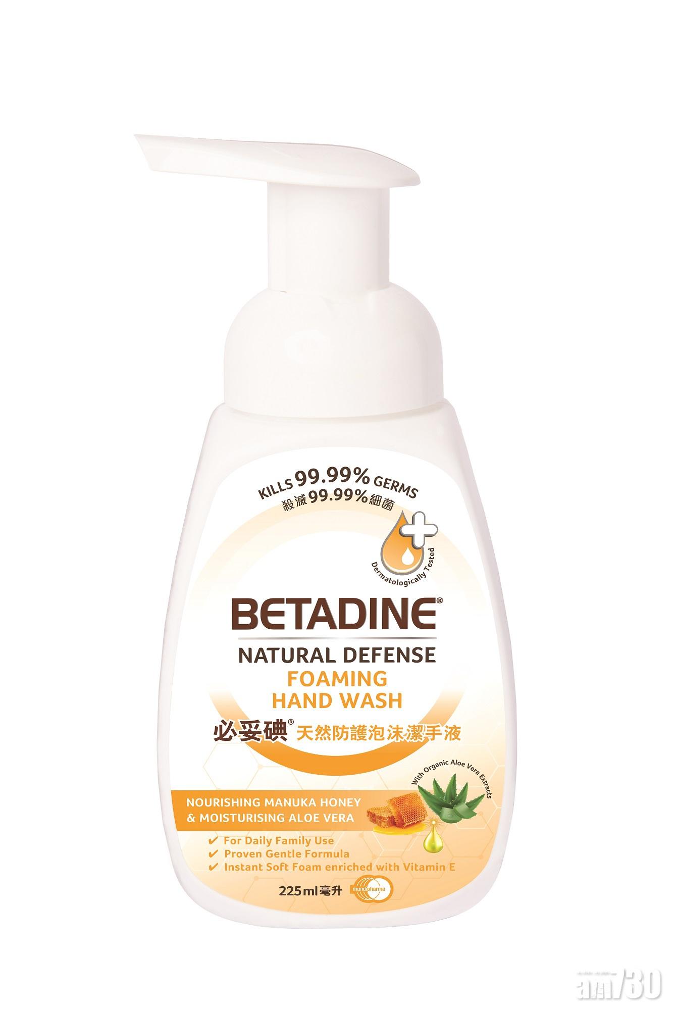 超過45年備受全港醫療機構及家庭信賴的BETADINE®必妥碘®,貼心研發出天然防護泡沫潔手液,具天然殺菌功效,且不含8大有害化學物質和刺激成分(二惡烷、甲醛、十二烷墓硫酸鈉等),當中的麥盧卡蜂蜜有天然殺菌功效,並結合有機蘆薈及維他命E等成分的天然防護潔手液,發揮著天然防護力量,再配合柔軟的泡沫配方能深入潔淨每一吋肌膚,幫您殺滅細菌的同時滋潤雙手。